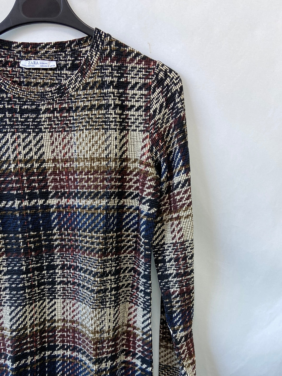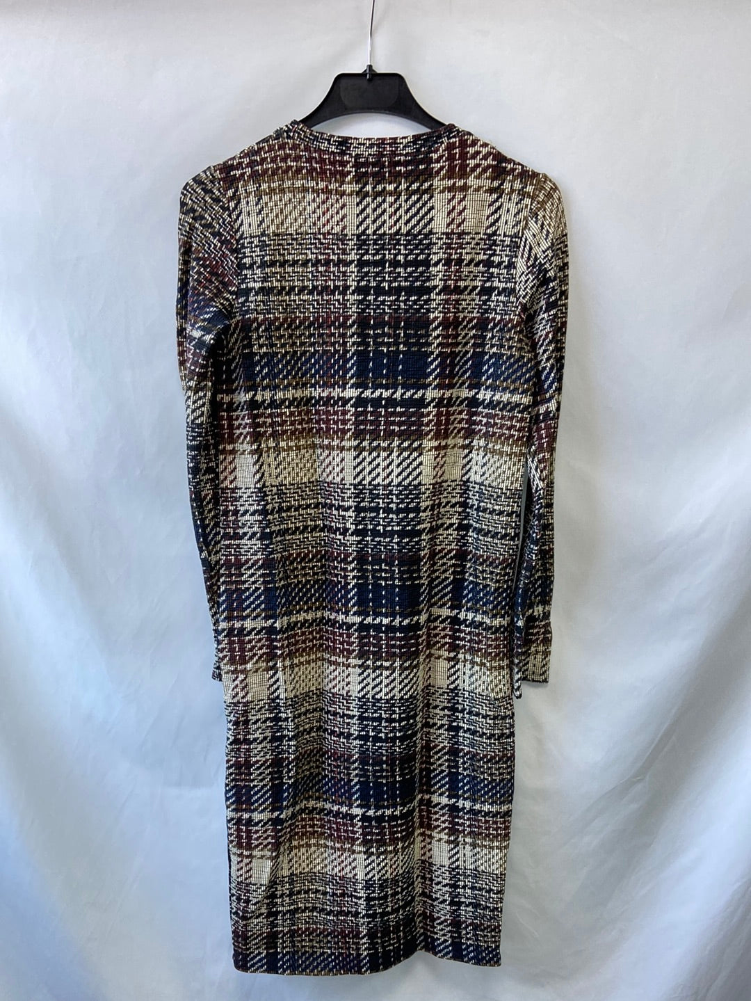Stretch midi dress in earth-toned textured fabric. 101 cm long.