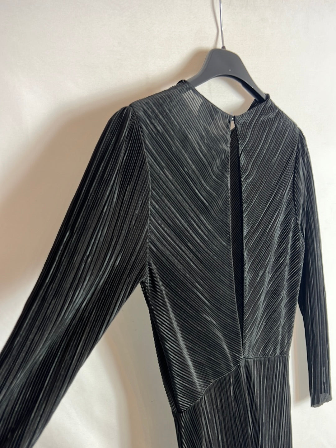 Black midi/long dress with a pleated texture and very little stretch. 142 cm long, center front opening.