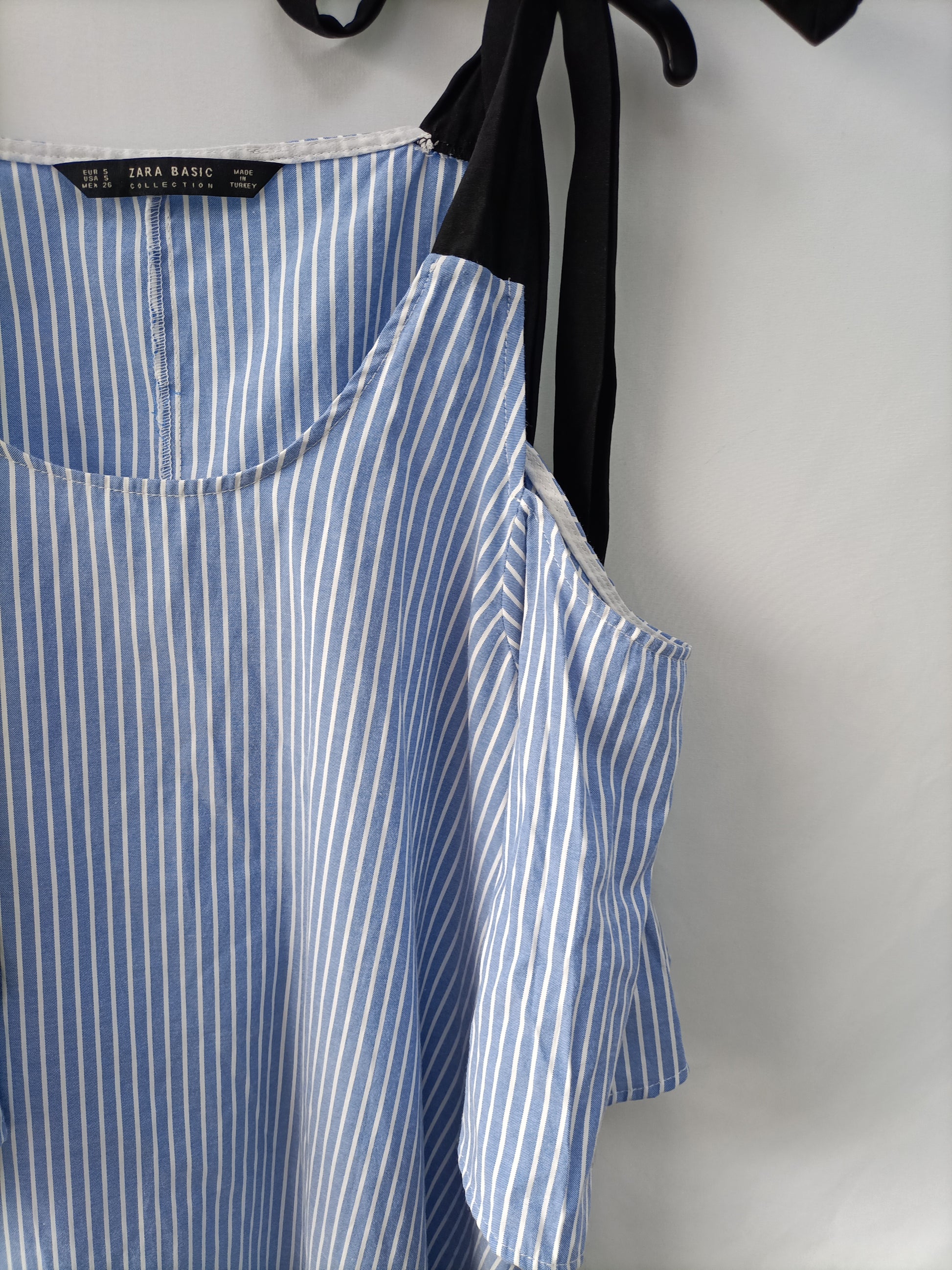 White and blue striped dress with adjustable black straps and sleeves. Length 82 cm.