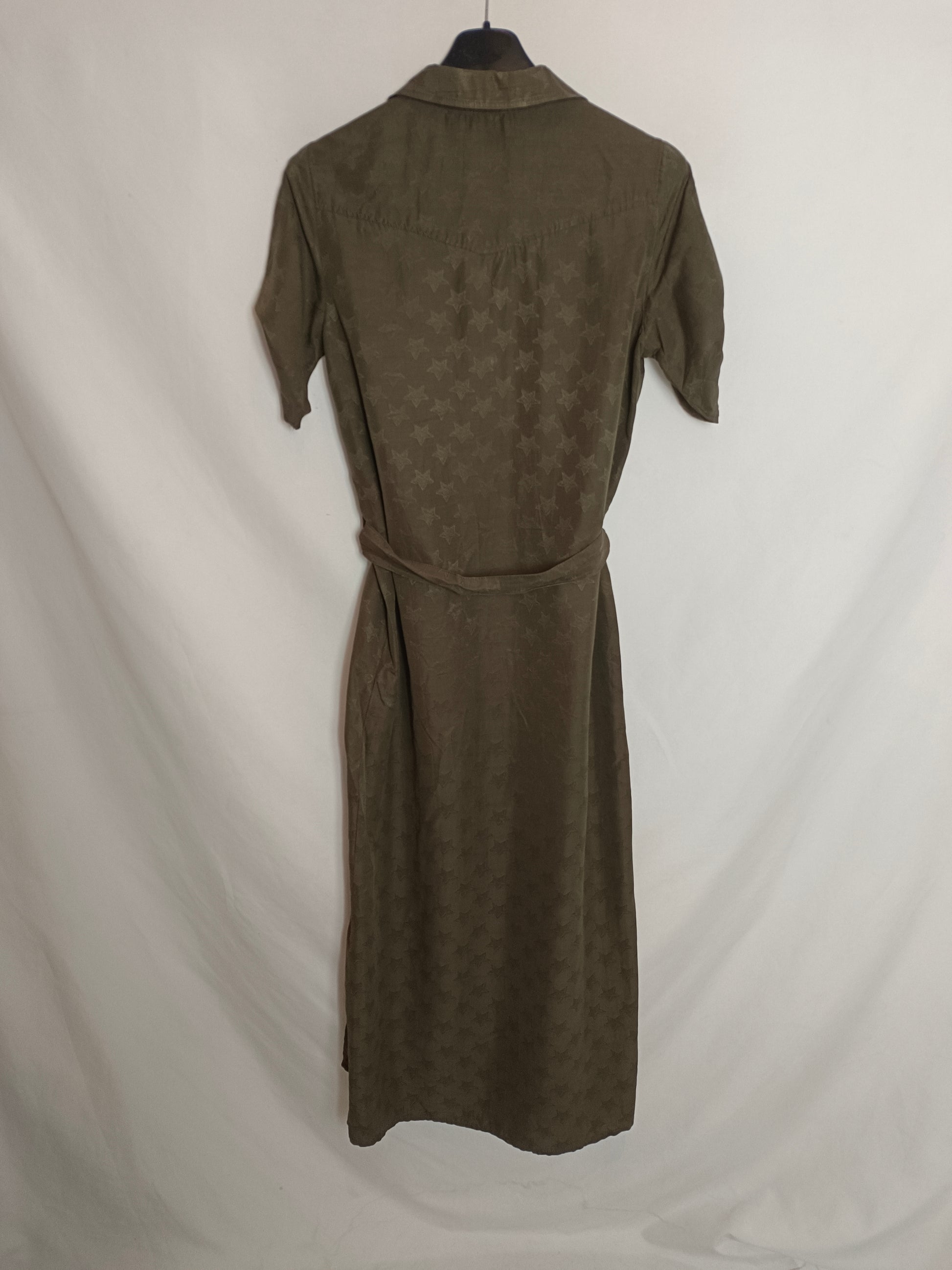 Long flowing shirt-style dress with a khaki green bow and star print.
