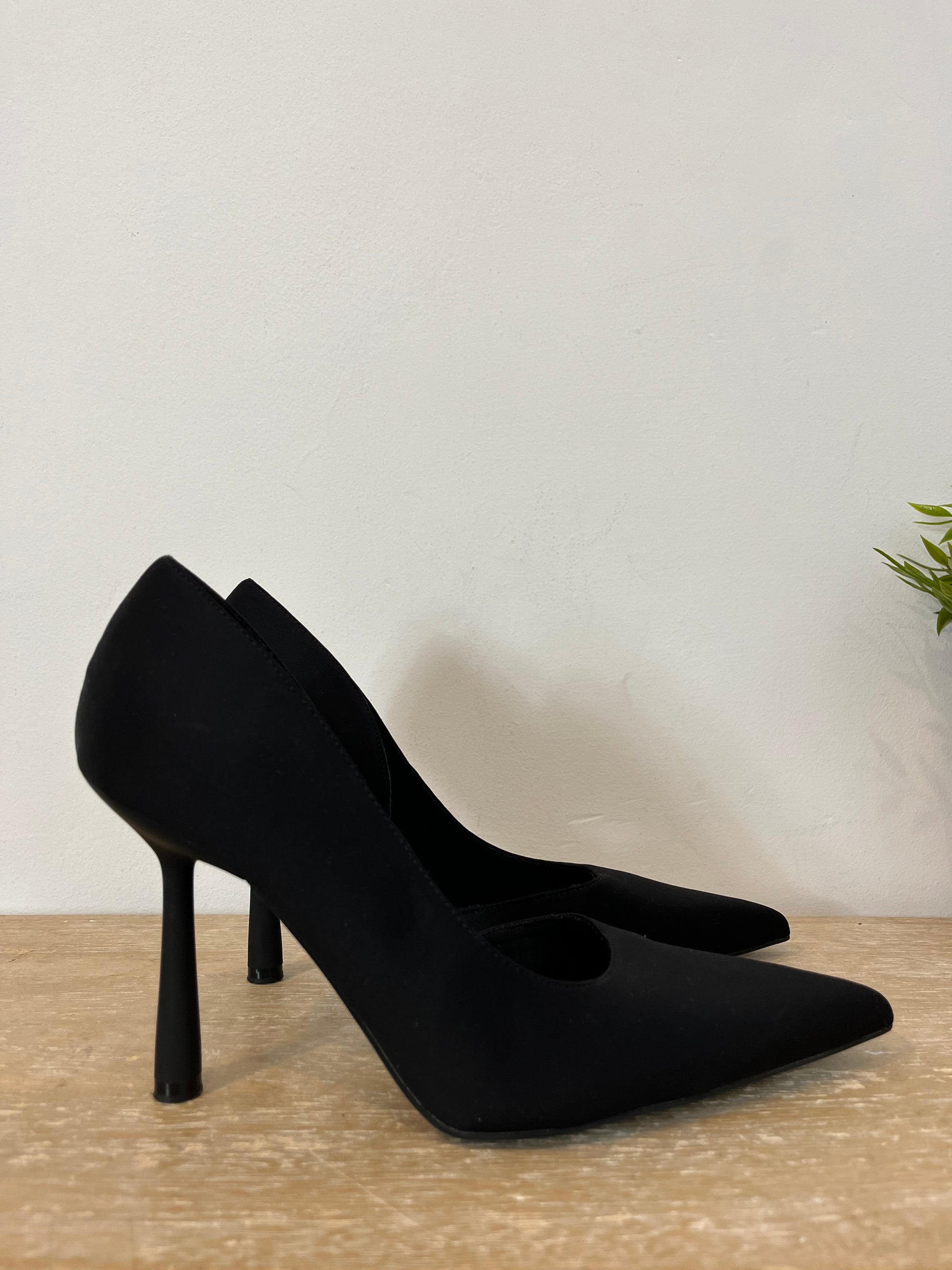 Black neoprene fabric high heel shoes.