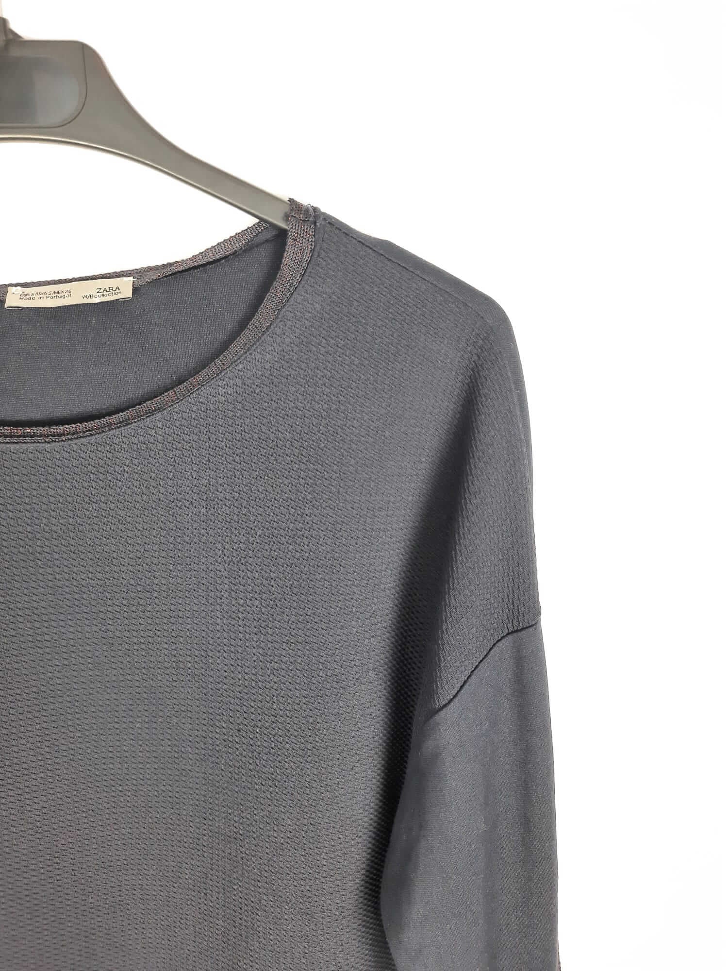 Zara. Navy blue T-shirt in a rough, stretchy fabric. Copper thread detailing on the neck and sleeves. Length 60 cm.
