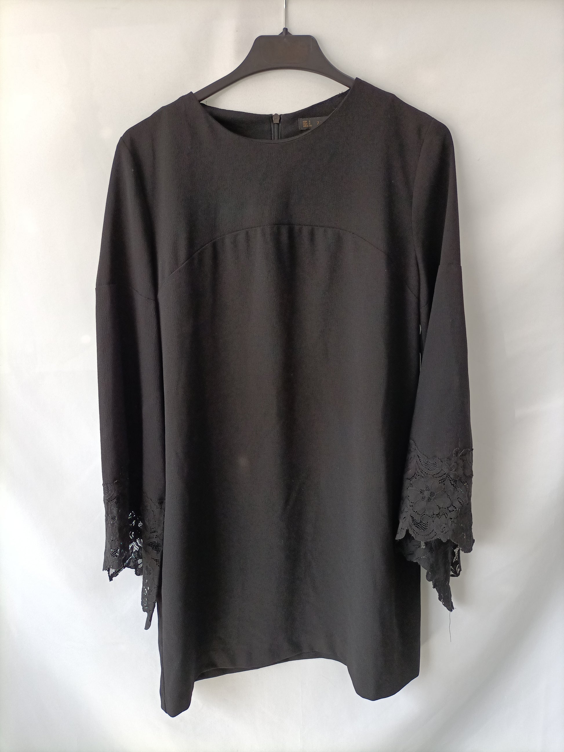 Zara. Short black dress with slightly flared sleeves and lace detail. Straight cut. No stretch. Armhole to armhole 46 cm, length 80 cm.