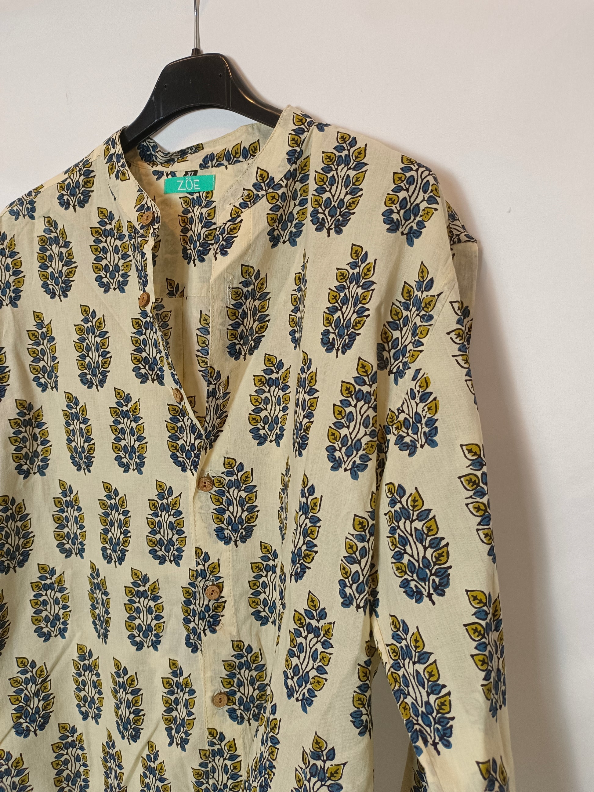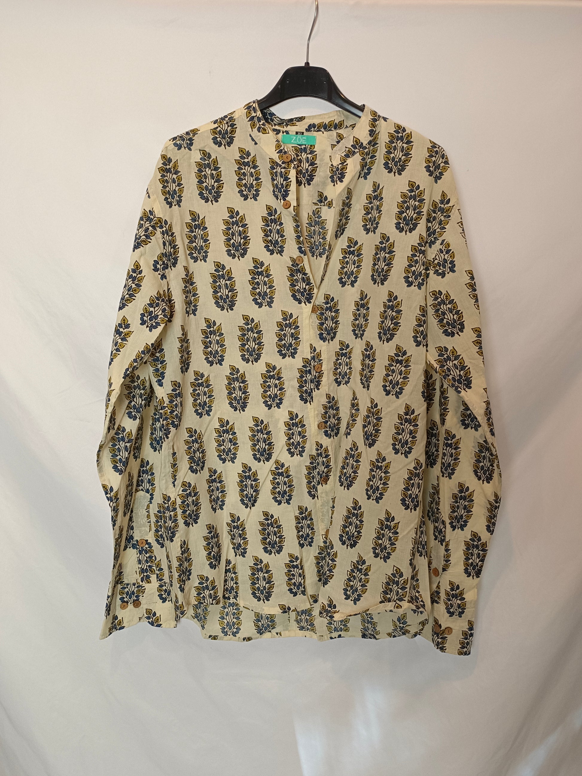Beige flowing blouse with a blue branch print. Back 53 cm, length 78 cm.