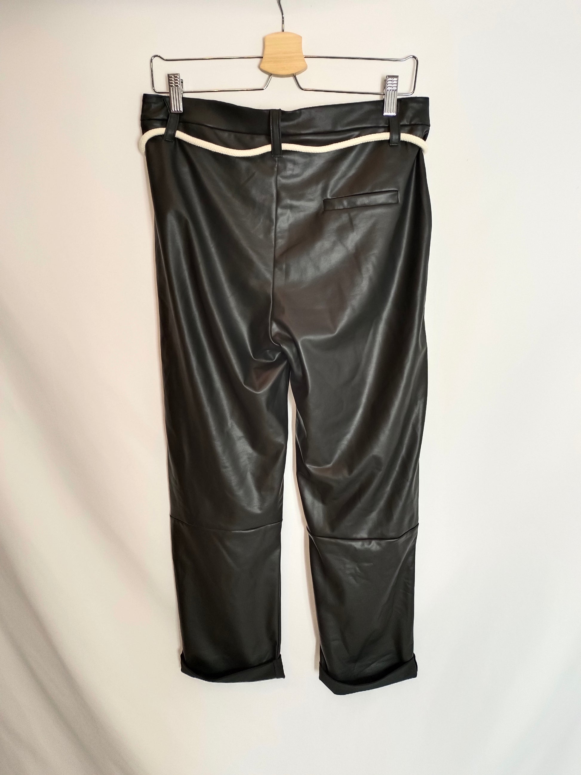 Pantalón negro de pinzas de tejido efecto piel cinturón de cuerda