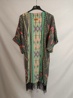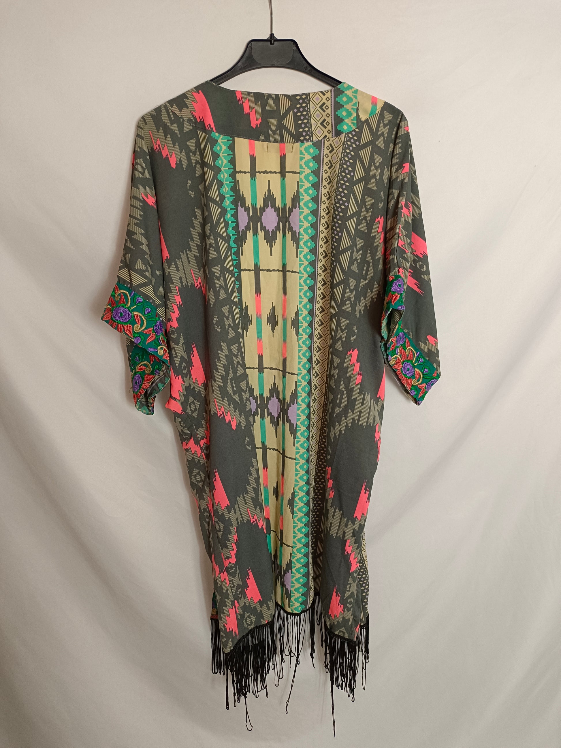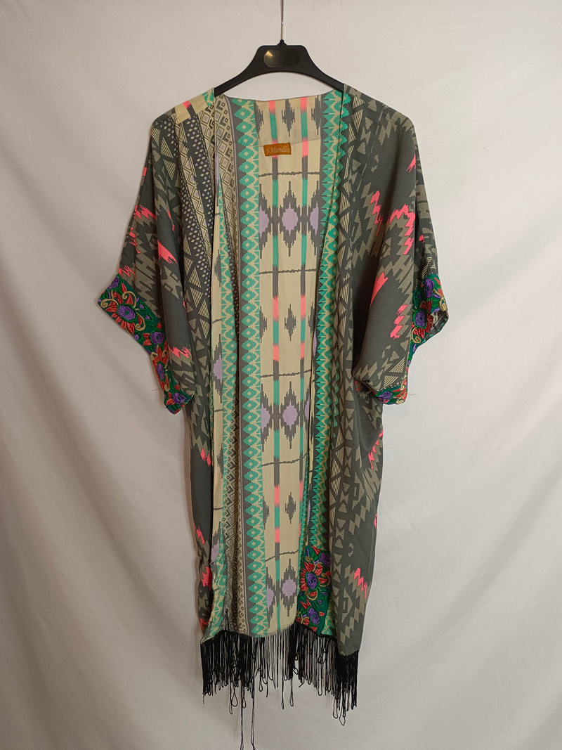 kimono fluido con estampado étnico y detalle bordado en las mangas.