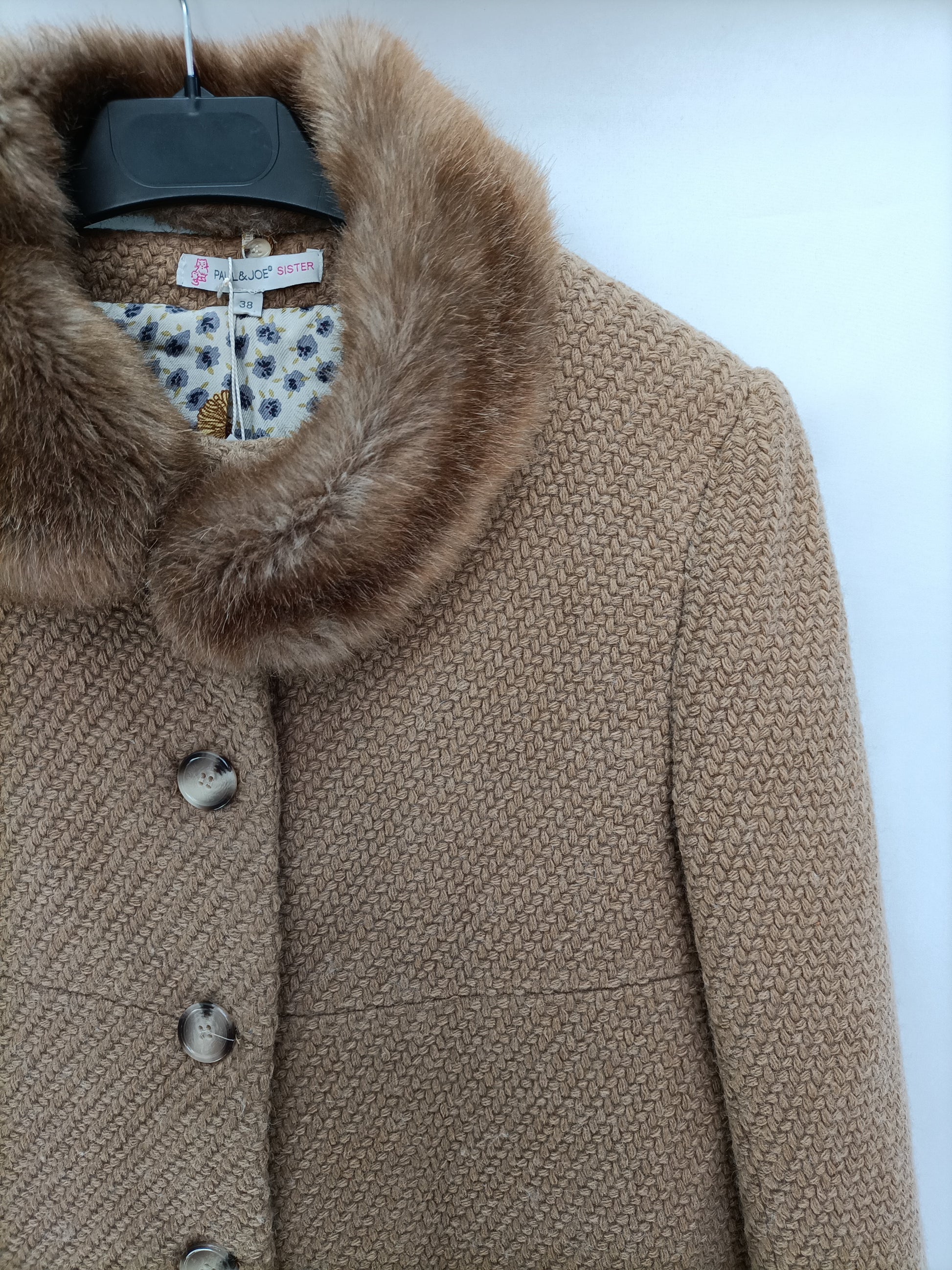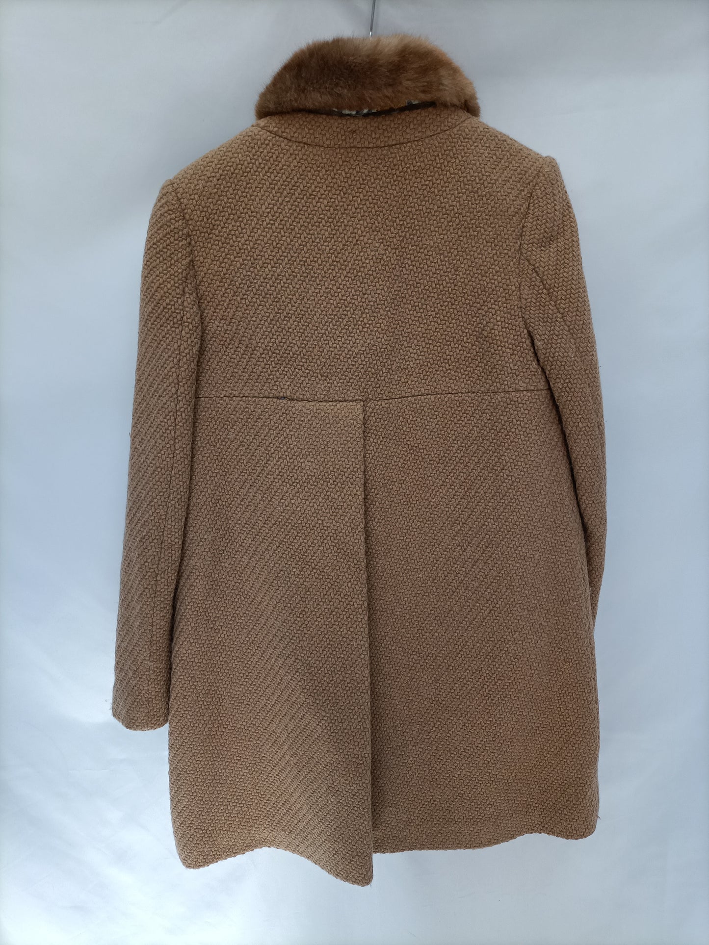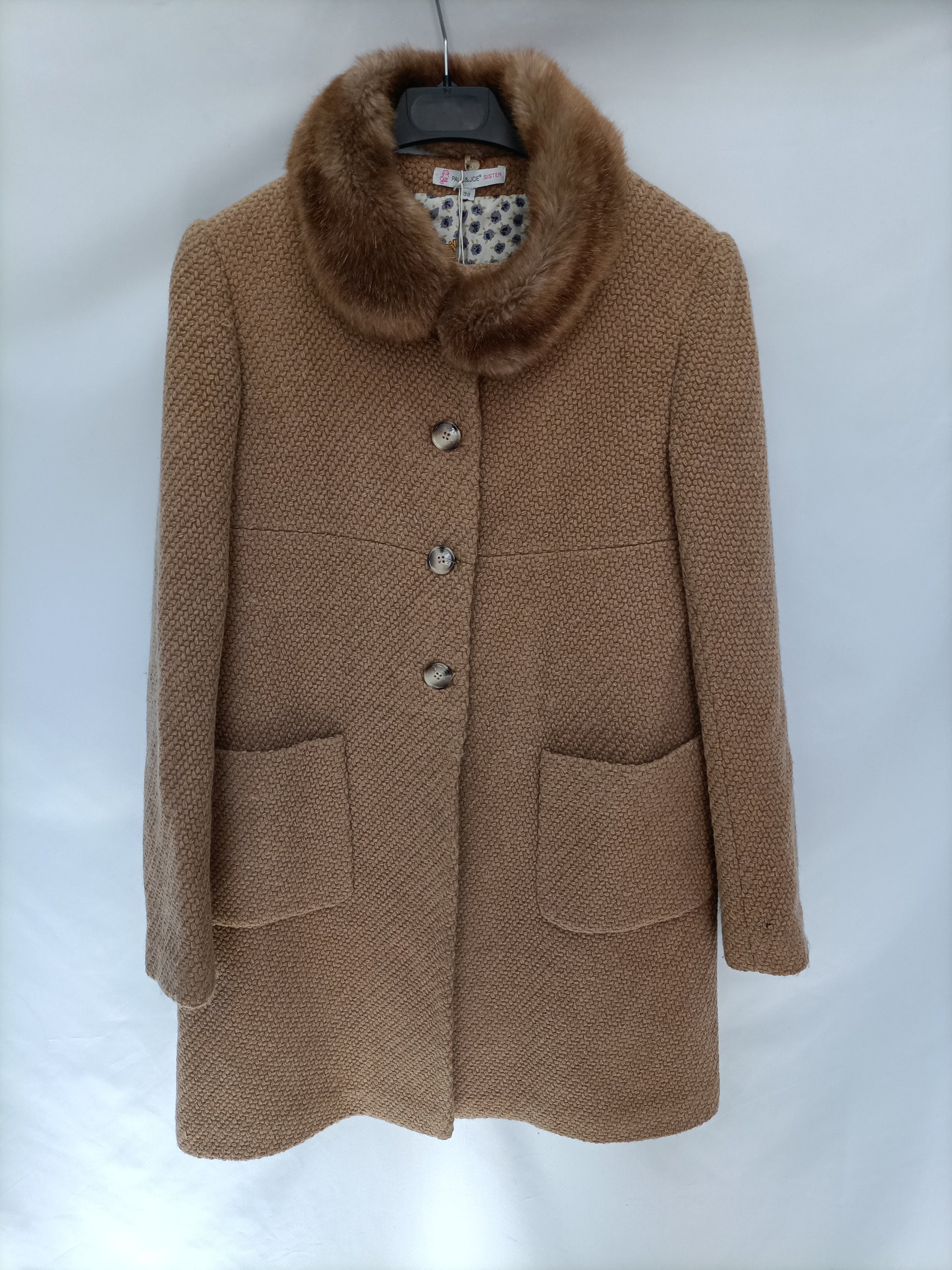 Abrigo camel con botones nácar, cuello de pelo y bolsillos delanteros al aire. De sisa a sisa 45 cm largo 84 cm