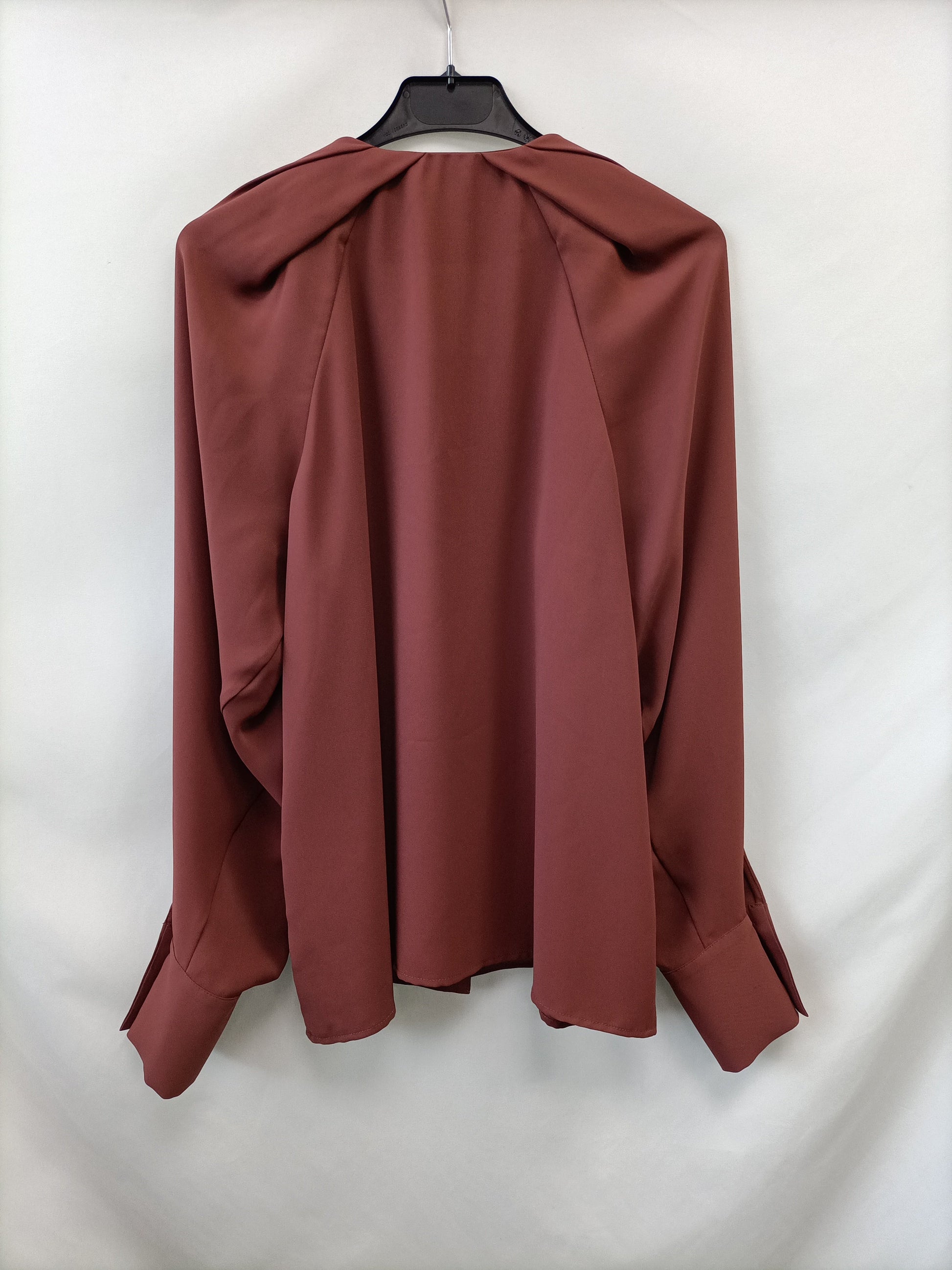 NUEVA CON ETIQUETA.Blusa burdeos apagado de poliéster, escote pico, mangas ligeramente abullonadas.