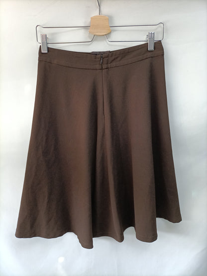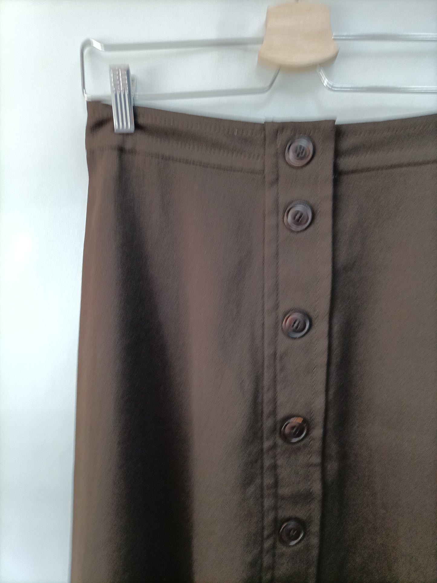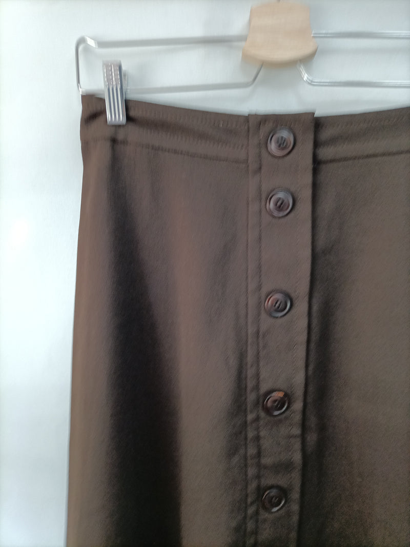 Falda marrón abotonada por delante de tejido semielástico. Largo 58 cm