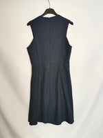 vestido largo por la rodilla cruzado azul marino de rayas diplomáticas.