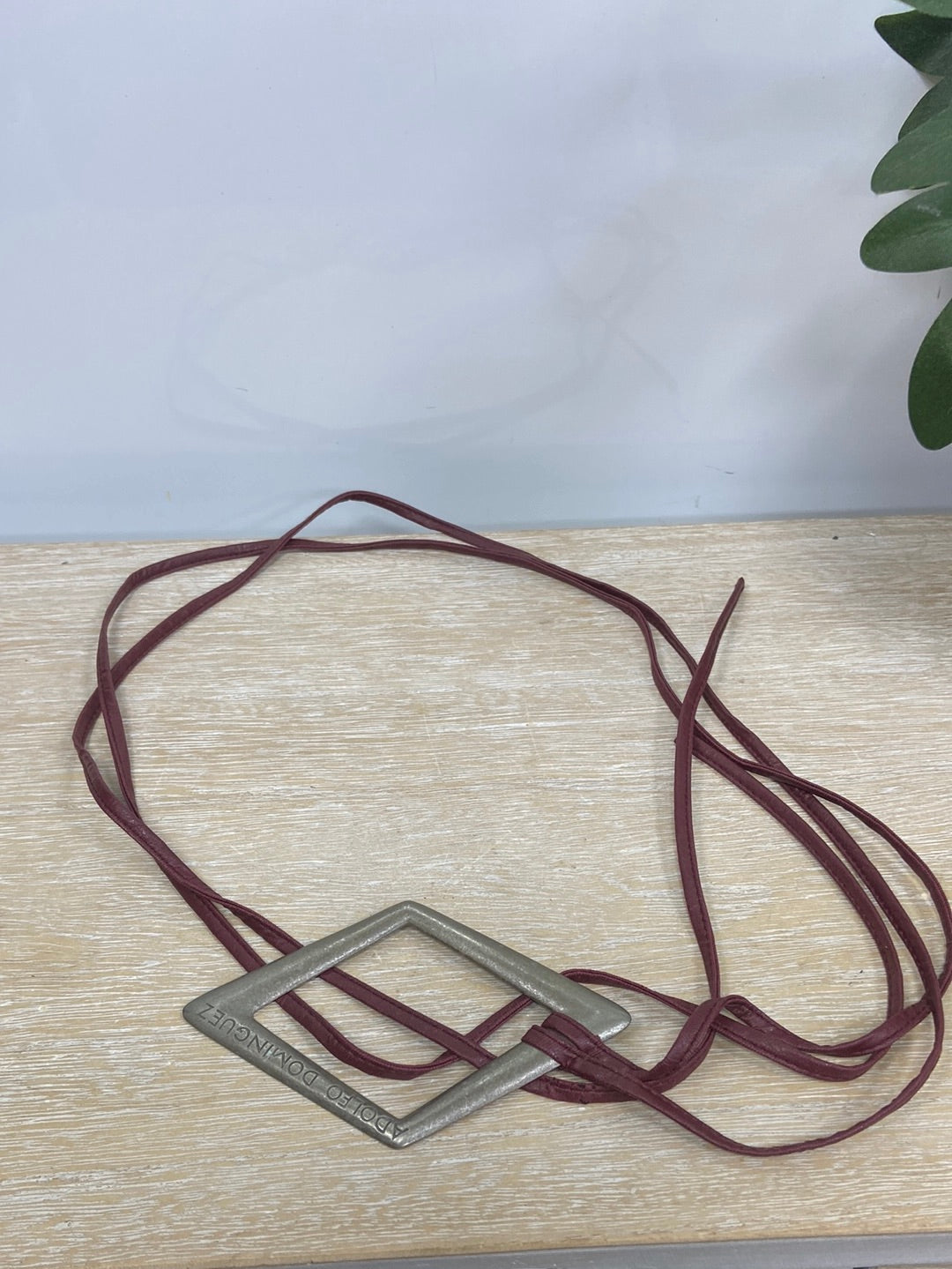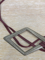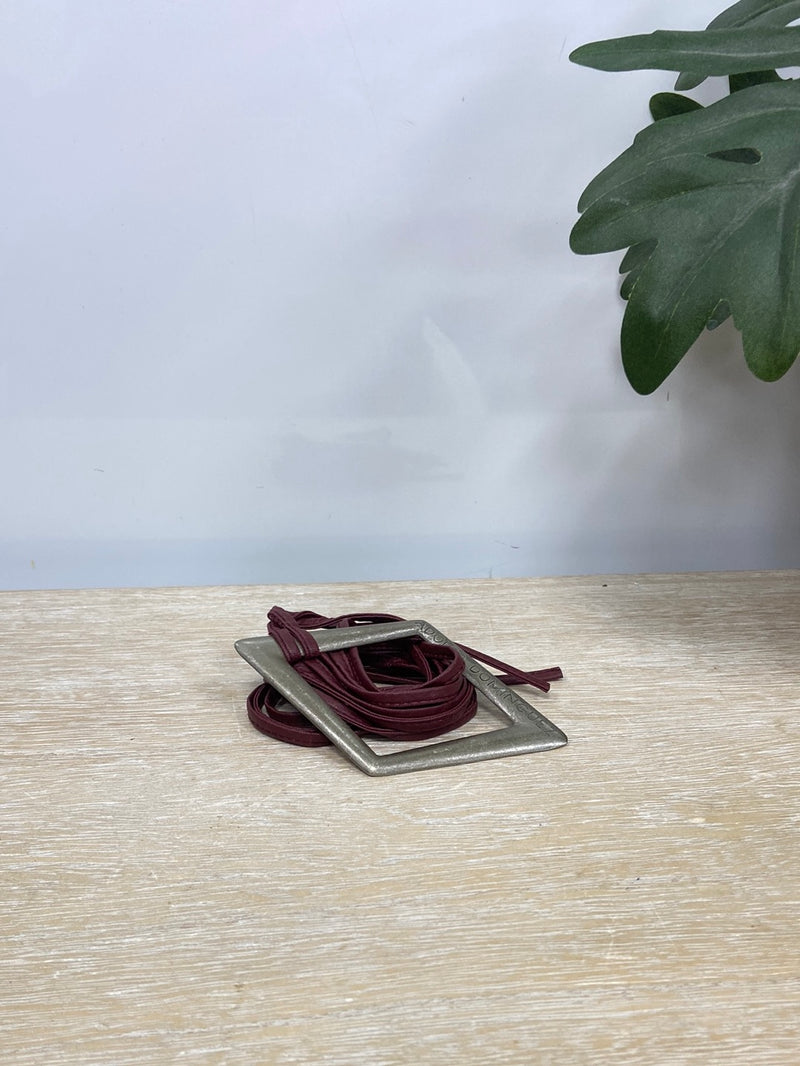 Cinturón de cuerda burdeos con hebilla cuadrada plateada. Largo 112