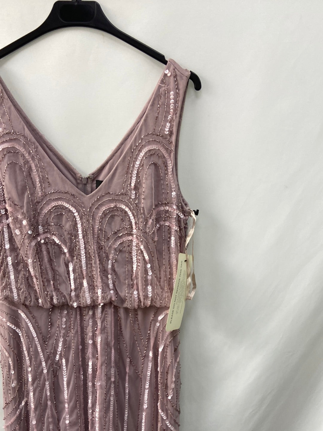 NUEVO CON ETIQUETA.Vestido rosa/lila pedrería. De sisa q sisa 47 cm largo 155 cm