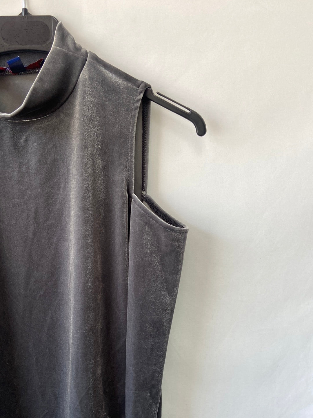 Top de terciopelo gris con mangas y los hombros al descubierto. Elástico. Largo 56 cm