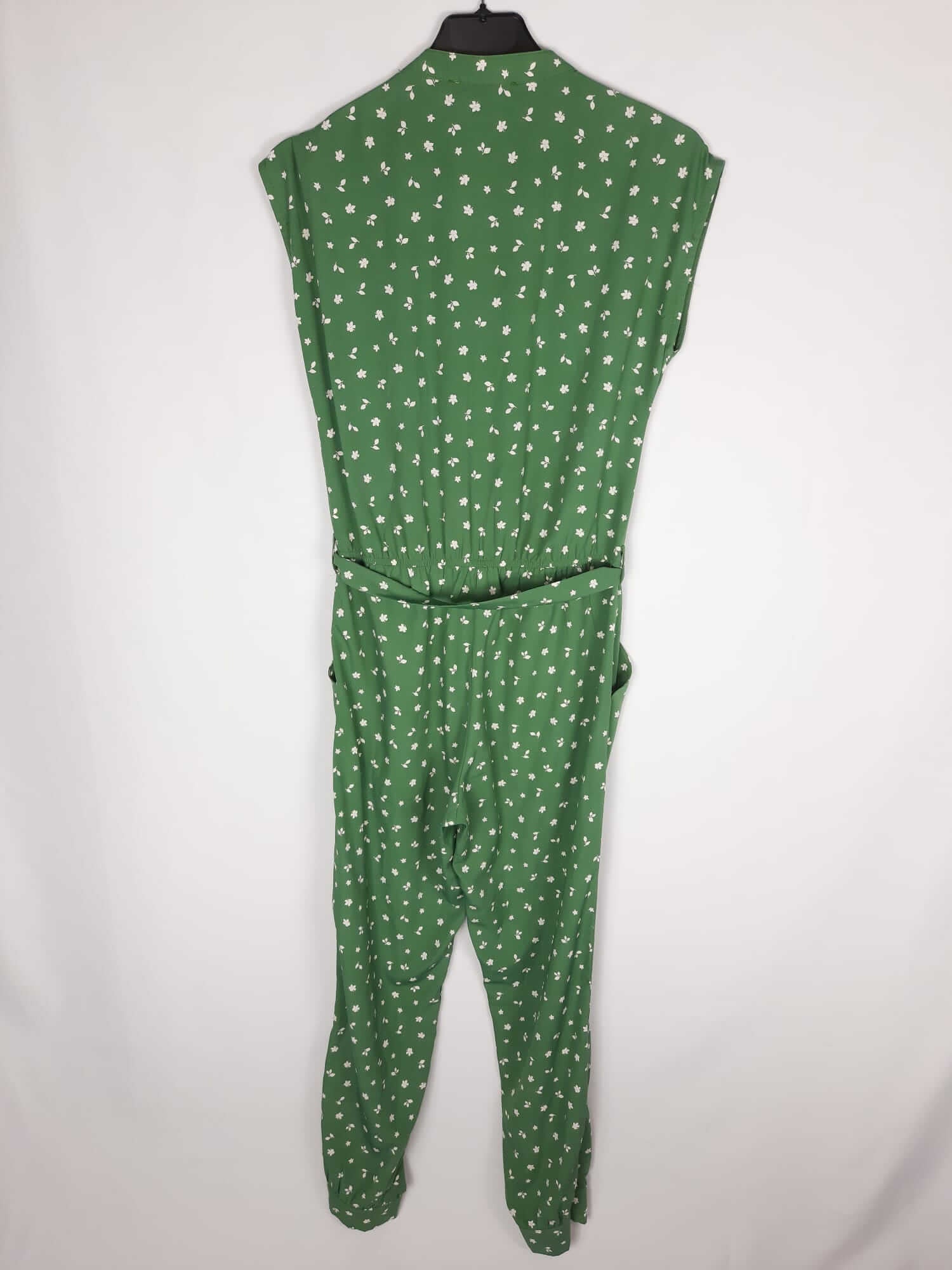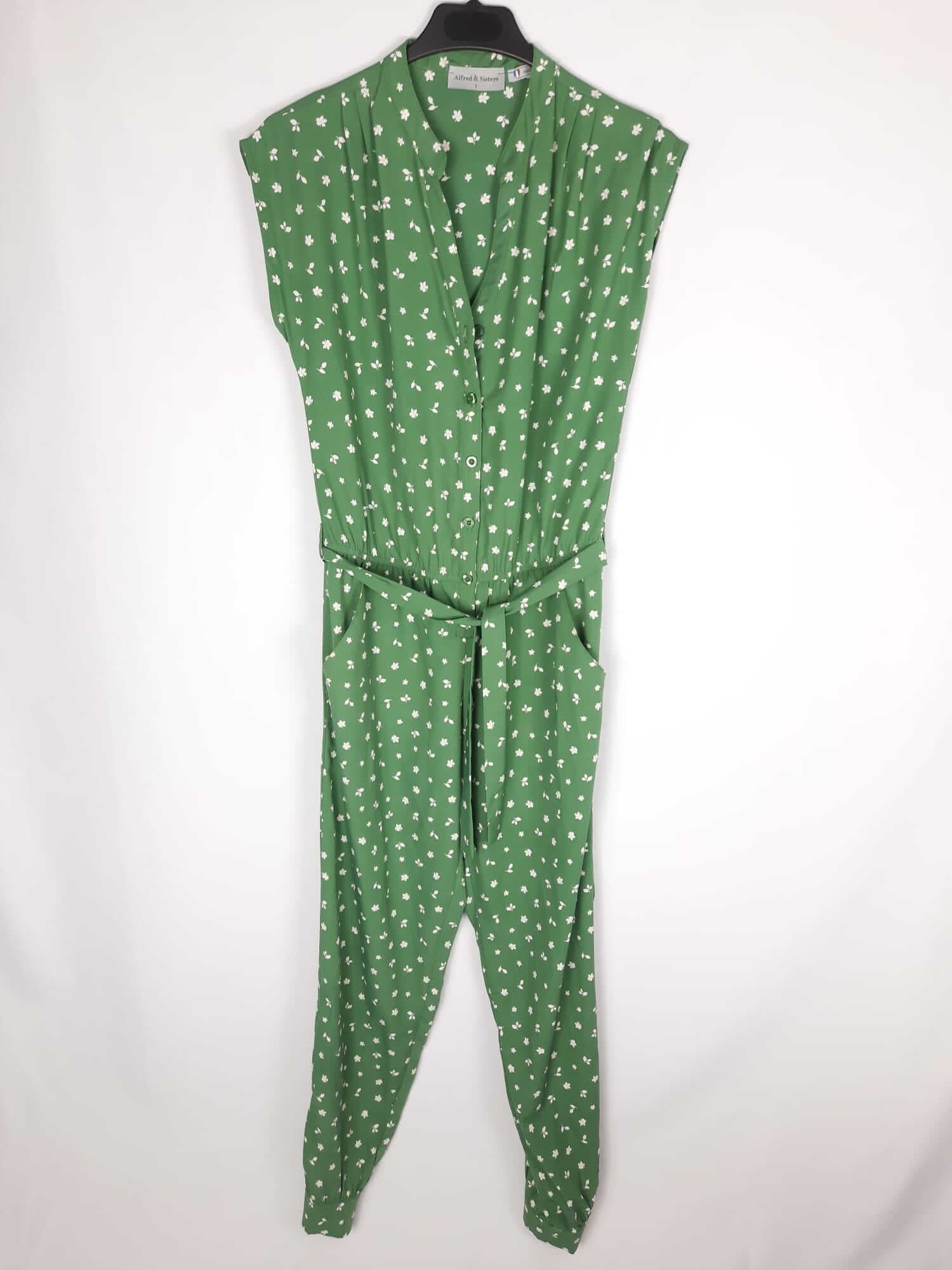 Alfred& sister. Mono fluido verde con flores. Abotonado por arriba con cintura elástica y lazada. De sisa a sisa 48 cm largo 132 cm
