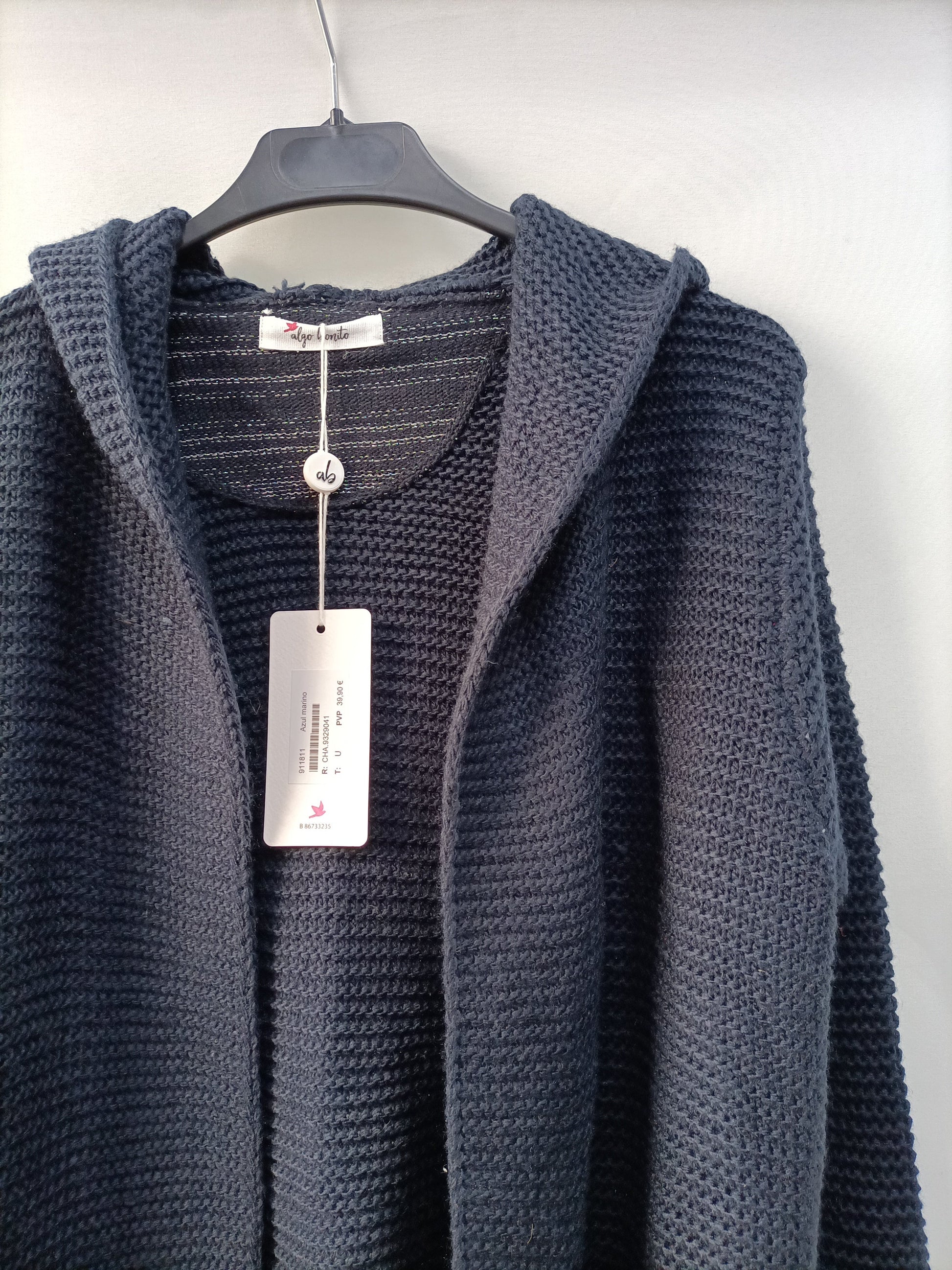 NUEVO CON ETIQUETA. Cárdigan azul de punto con capucha. largo 69 cm