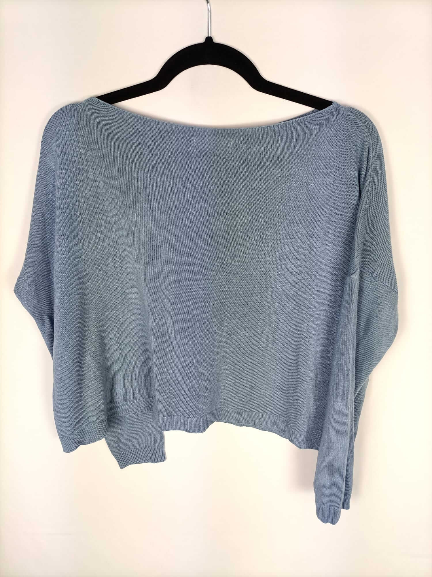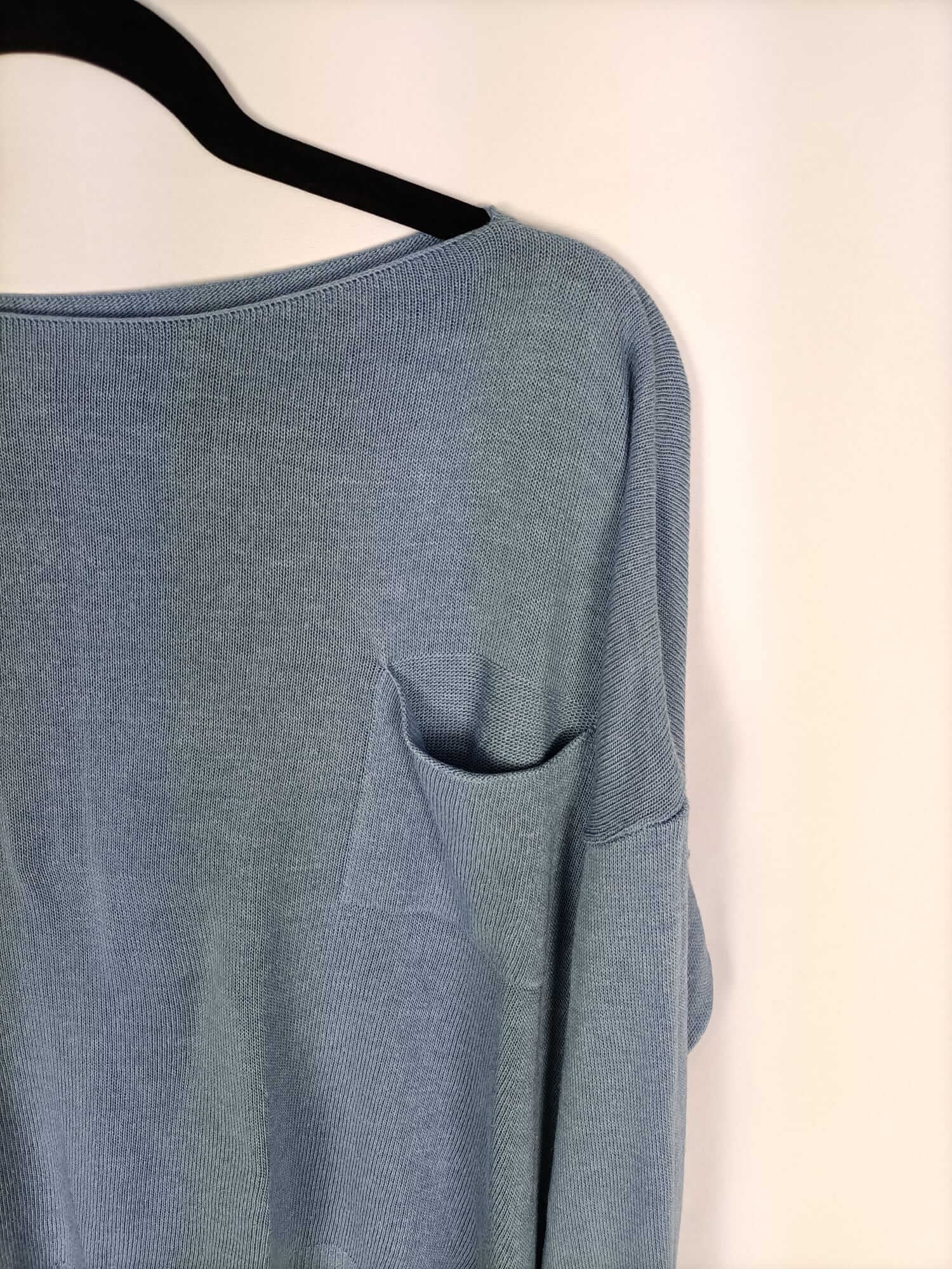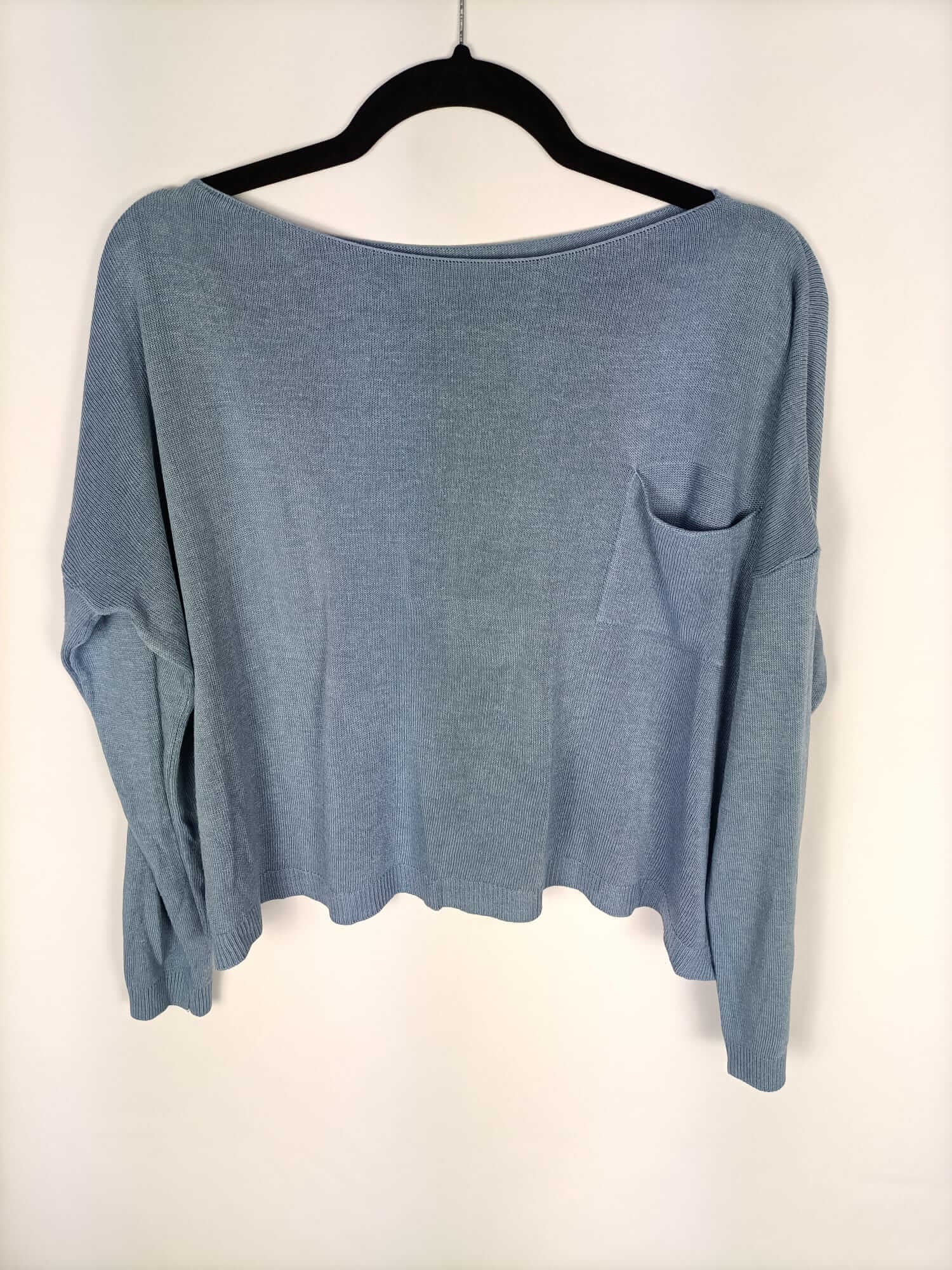 Algo bonito. Jersey fluido y cortito azul celeste oscuro con mini bolsillo. Elástico. Largo 46 cm