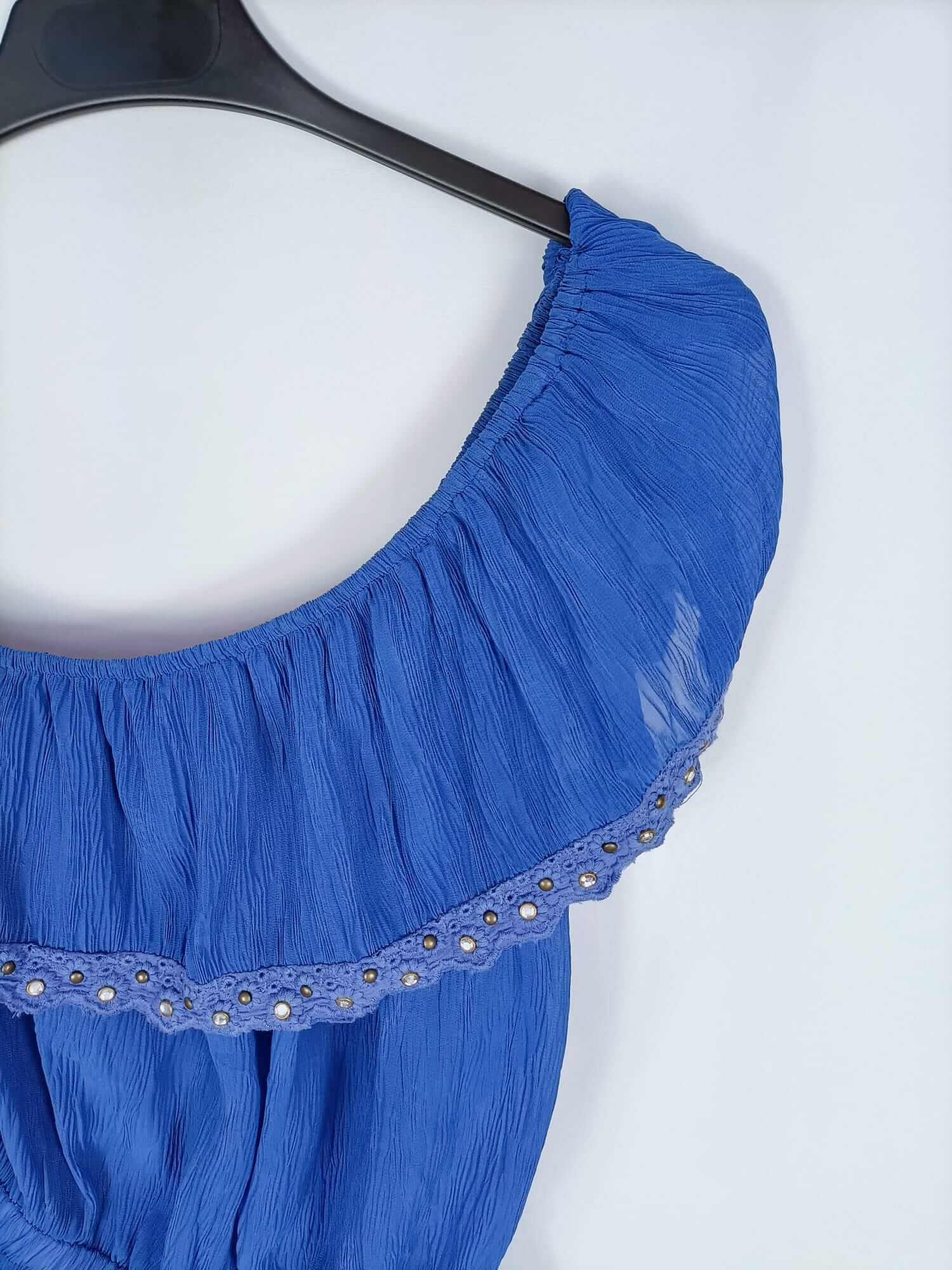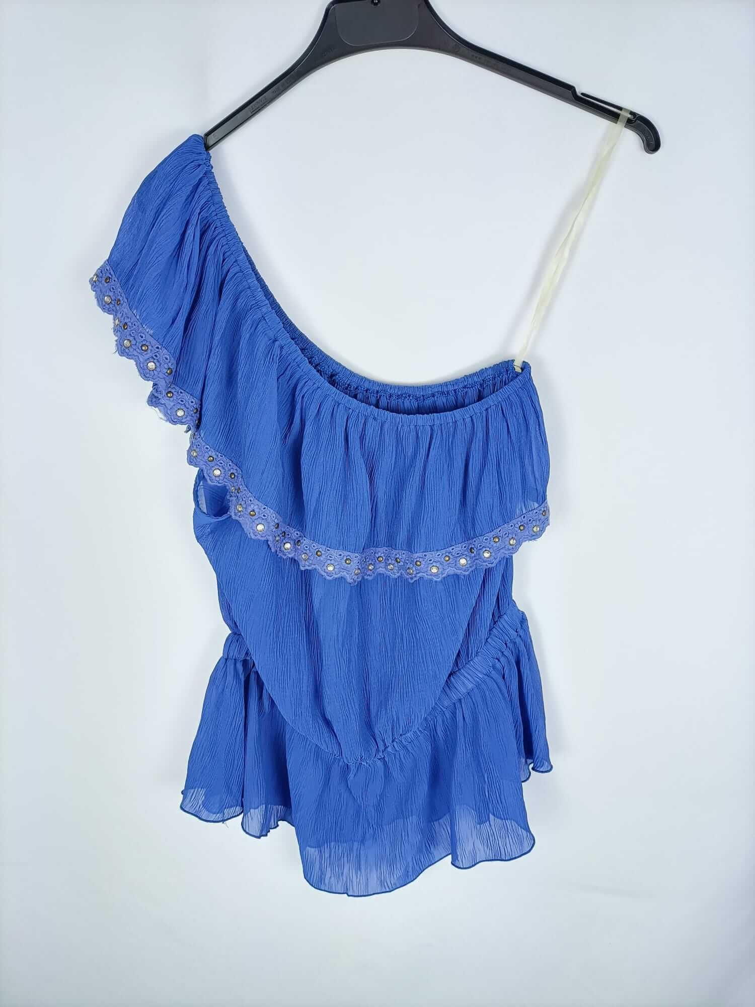 Ali jo. Top azul asimétrico con volante en el escote y detalle de tachuelas. Tejido fruncido. Elástico. Semitransparente. Largo 60 cm