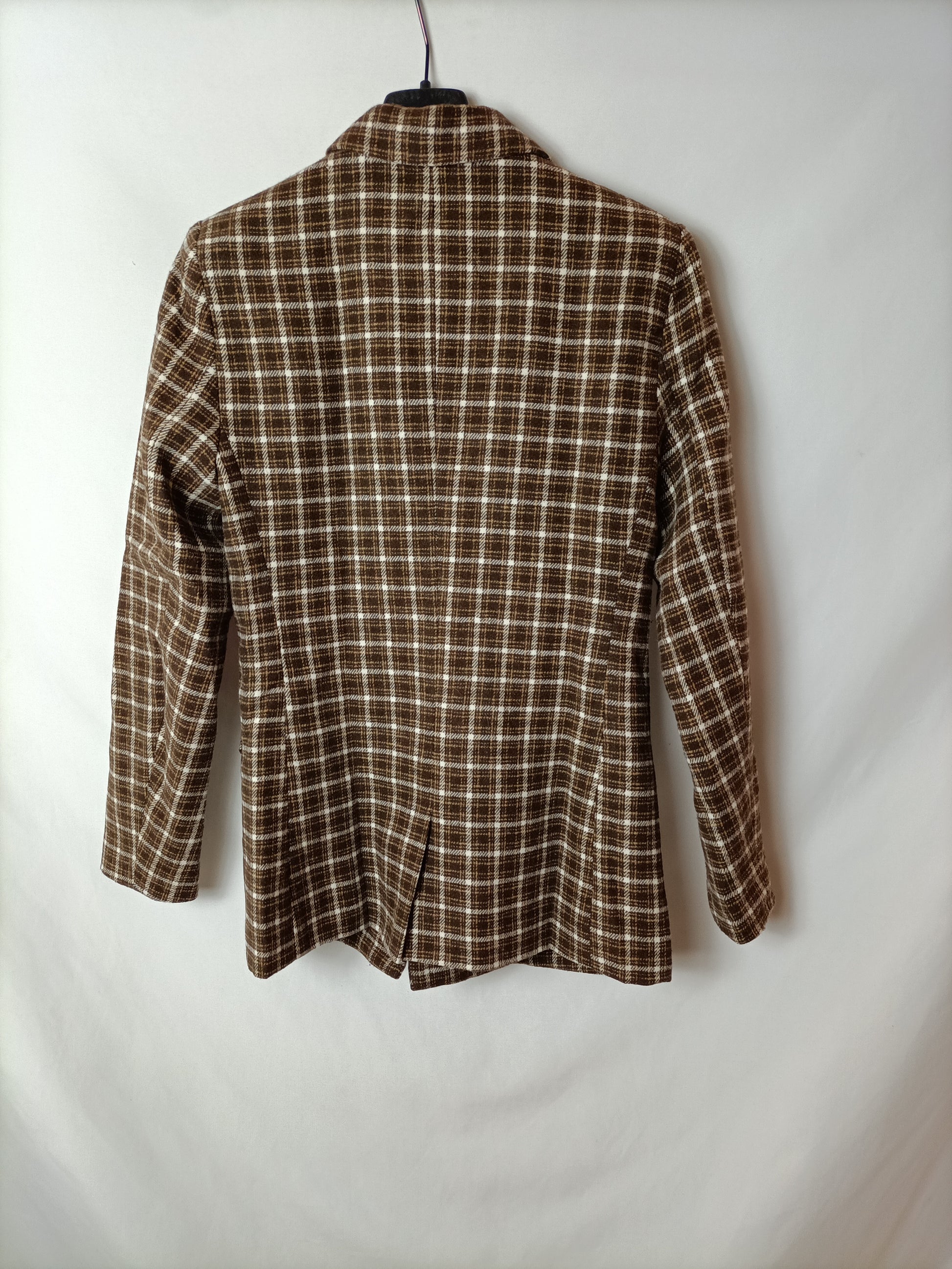 Blazer marón con cuadros en crudo. tejido tipo paño. No elástica. de sisa a sisa 42 cm largo 68 cm