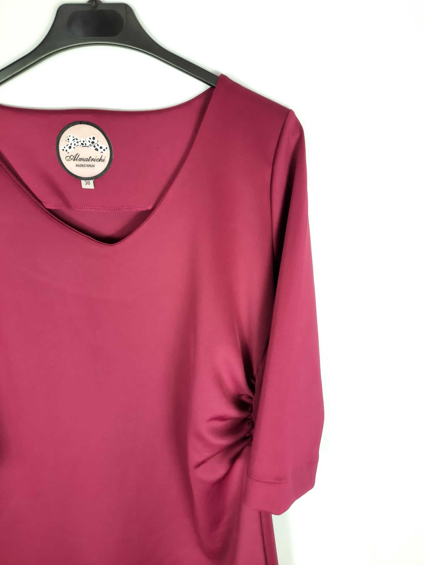 Almatrichi. Vestido corto de licra con detalle fruncido. Color buganvilla. Elástico. Largo 93 cm
