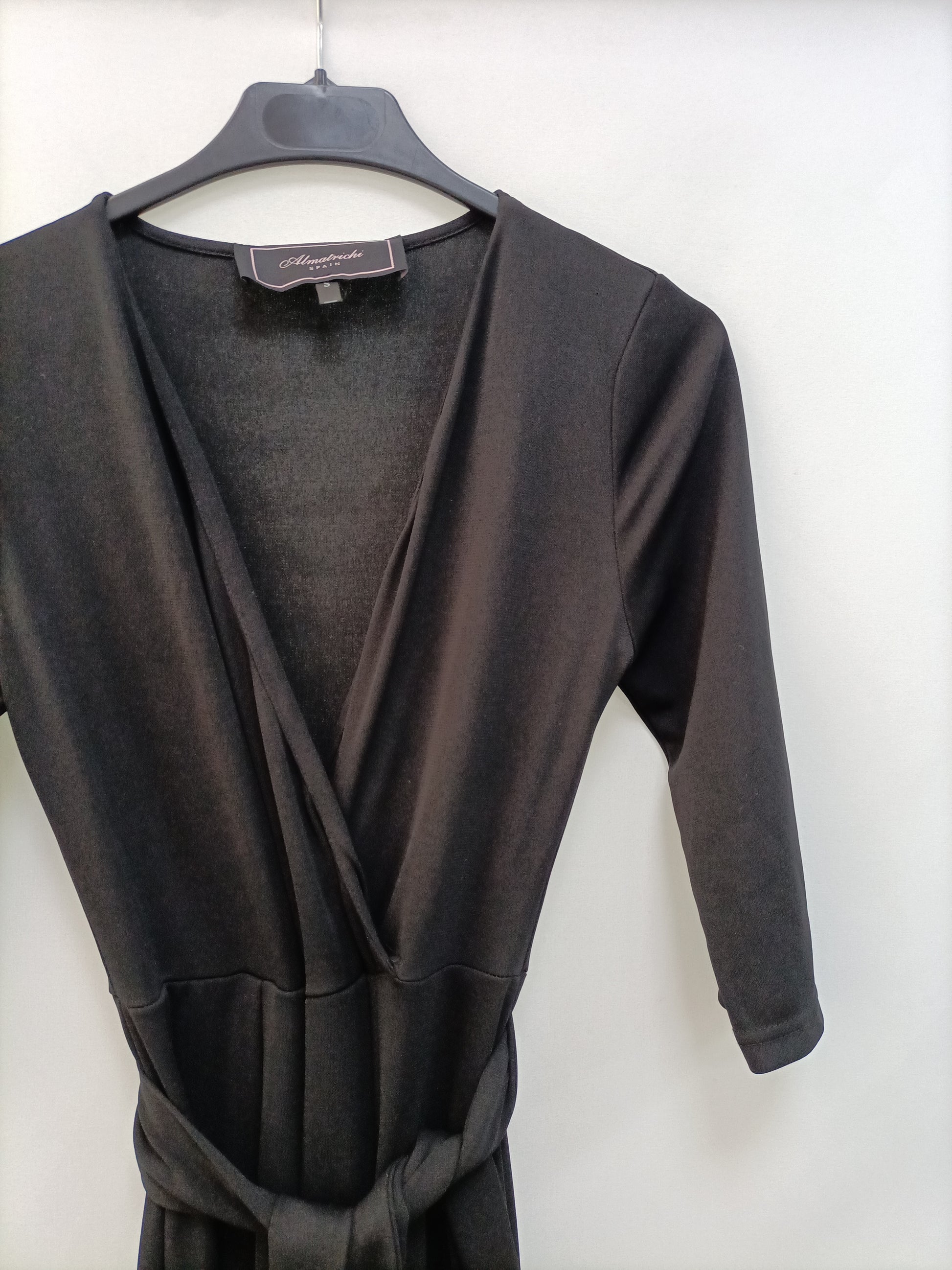 vestido largo negro de tejido tipo licra elástico. lazada en la cintura. largo 140 cm