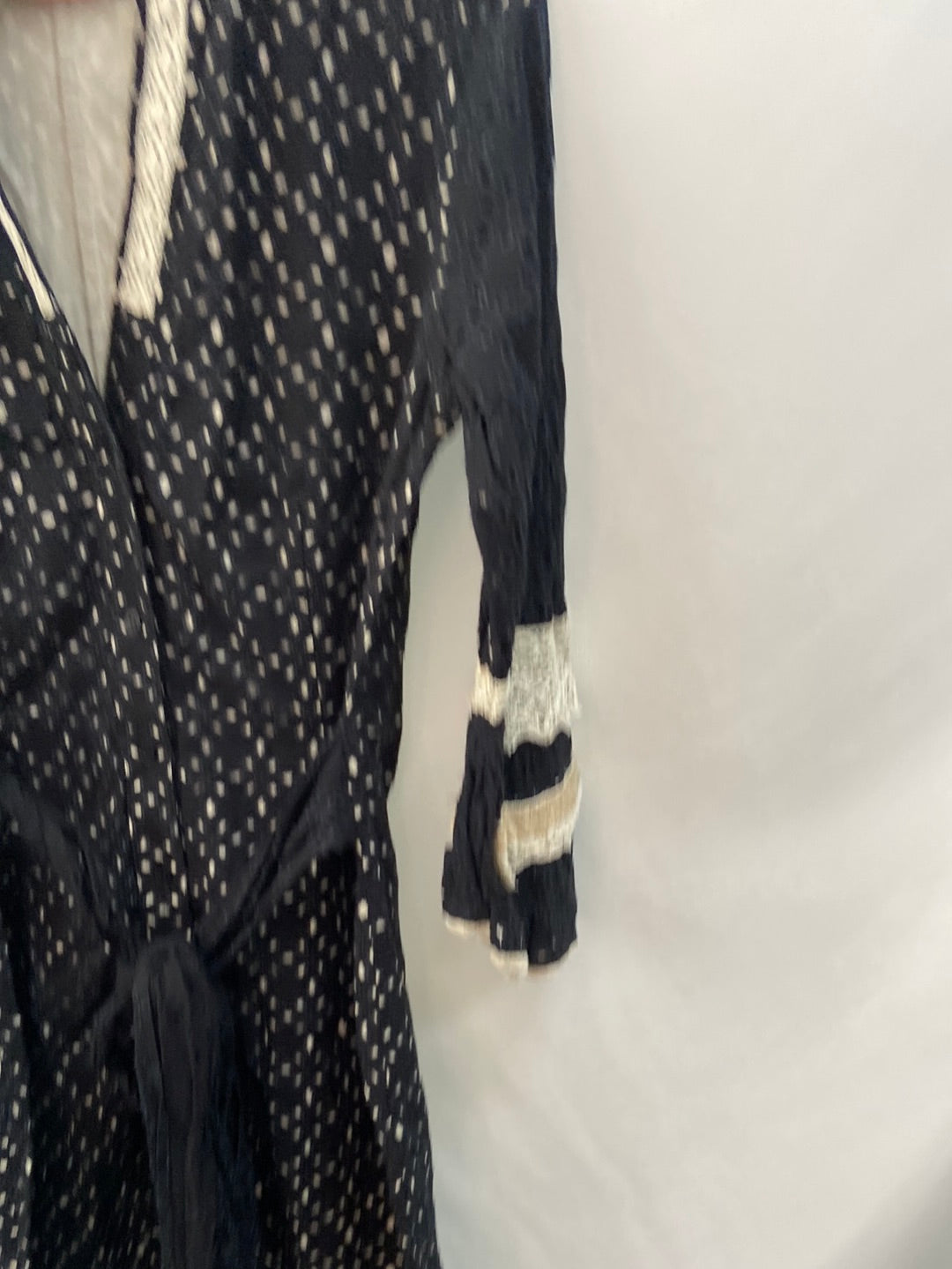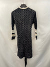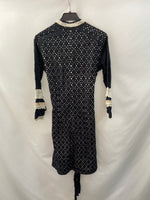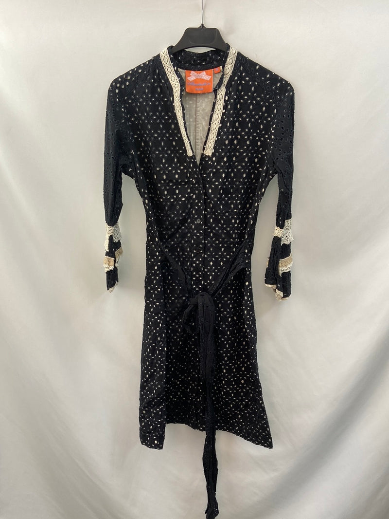 Vestido troquelado negro y beige con detalles de croché, entero abotonado forro interior. De sisa a sisa 49 cm, y de largo 96 cm