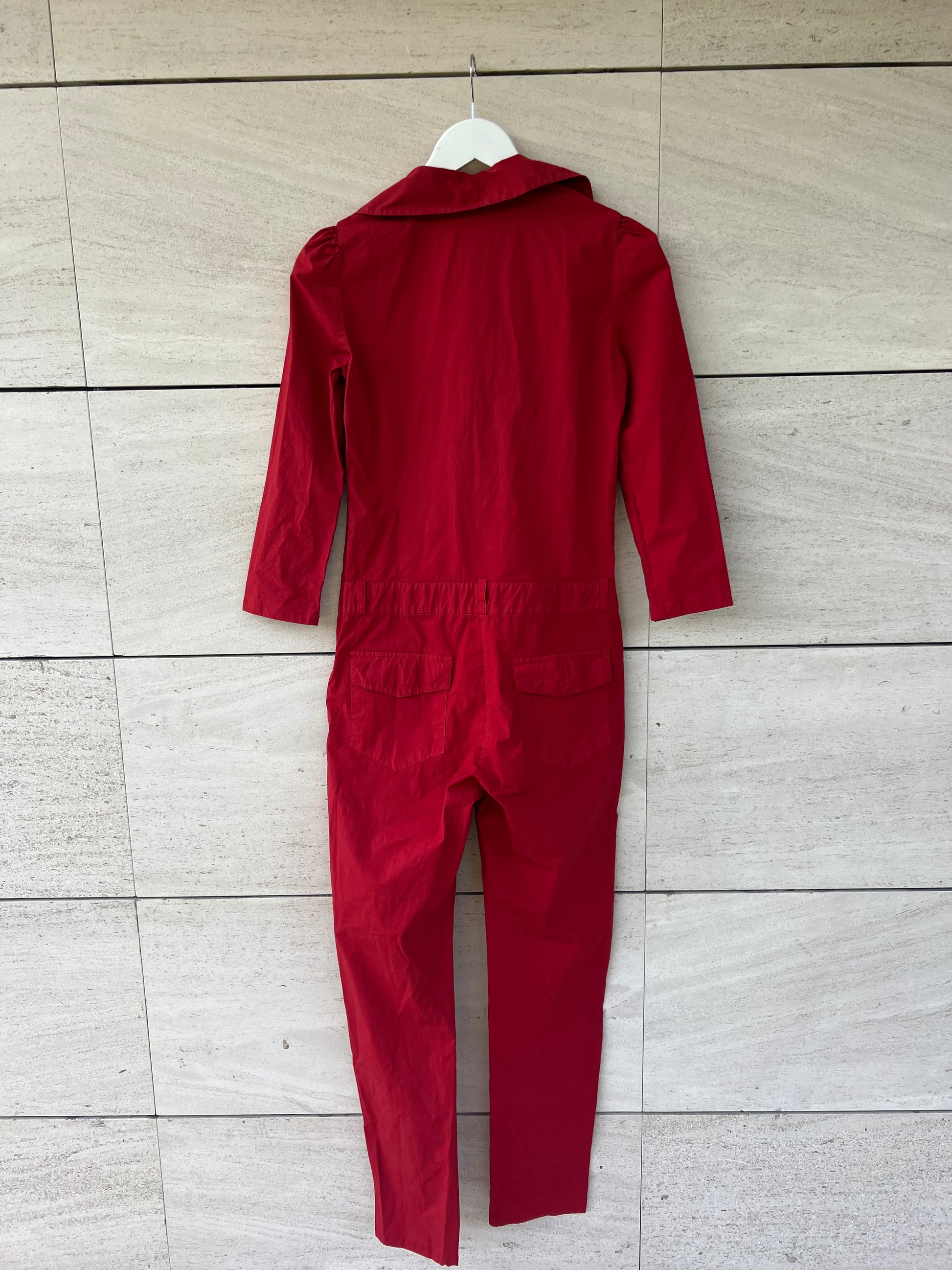 Mono largo rojo de tejido fino abotonado en el escote. no elástico. De sisa a sisa 46 cm cintura 39 cm, largo 143 cm