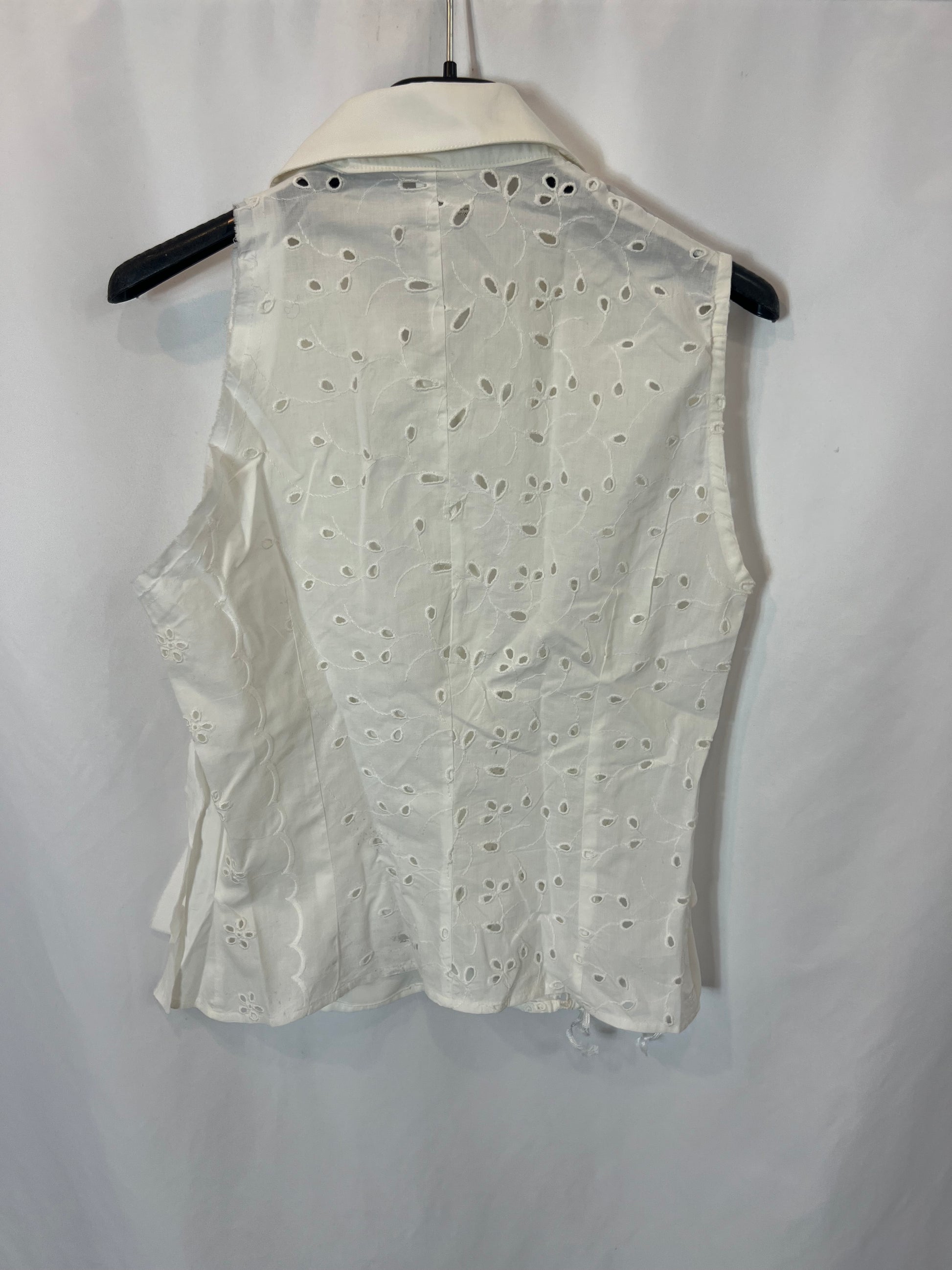 Blusa blanca sin mangas con varias texturas. fruncidos, flecos y troquelado. De sisa a sisa 44cm, largo 52cm