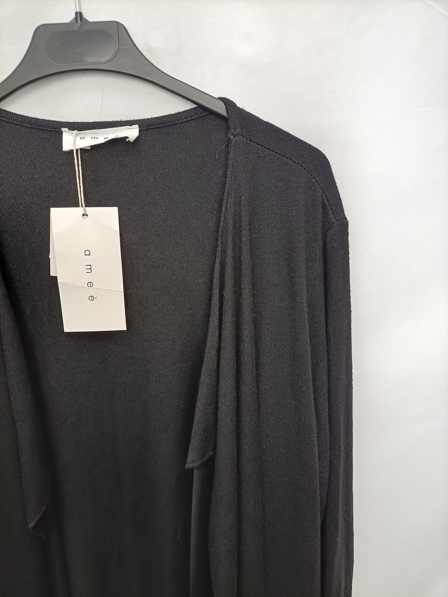 Amee. TU (M). NUEVO CON ETIQUETA. Rebeca negra fluida con solapa de doble textura. Elastico. Largo 70 cm