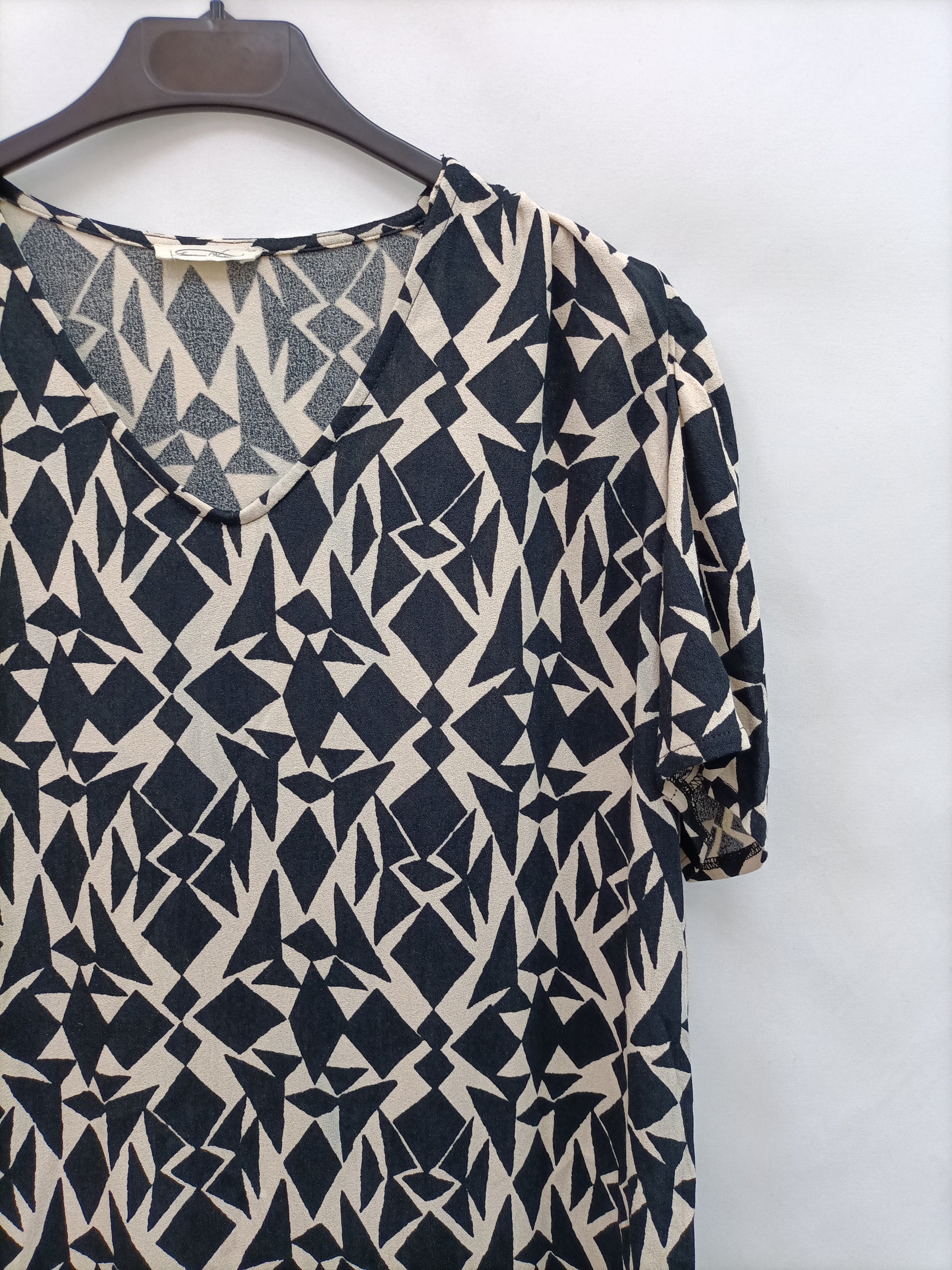 Vestido beige con estampado negro cuello pico fluido. De sisa a sisa 47 cm largo 87 cm