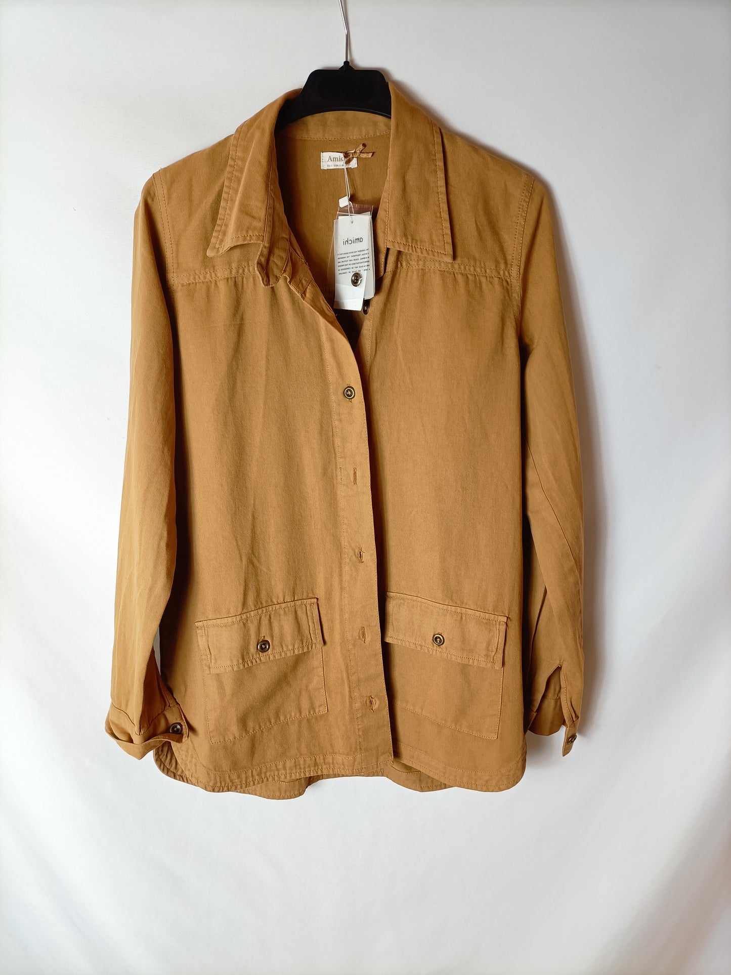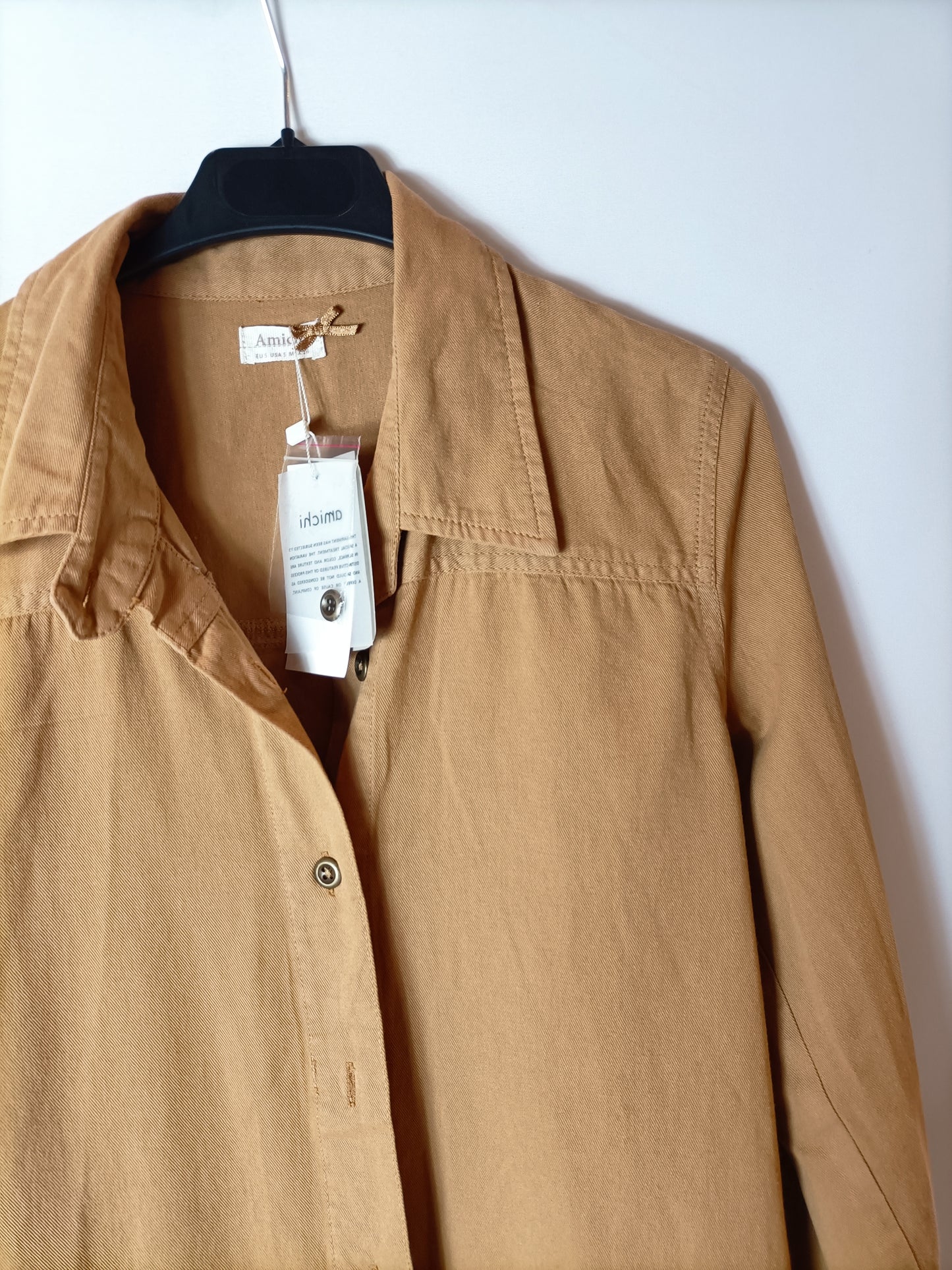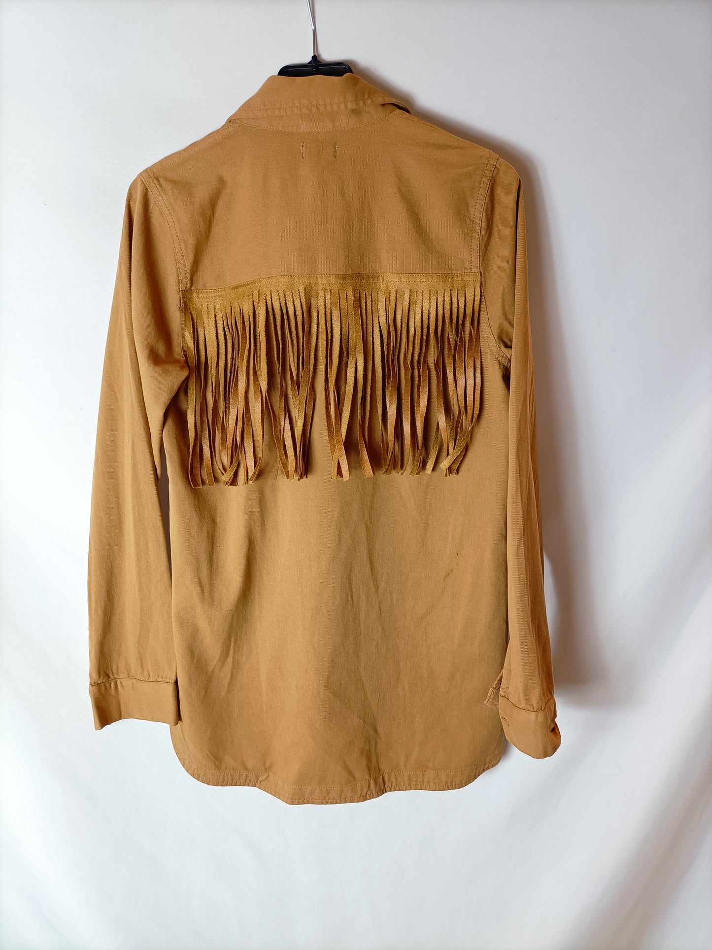 NUEVO CON ETIQUETA. Chaqueta finita mostaza con flecos. abotonada