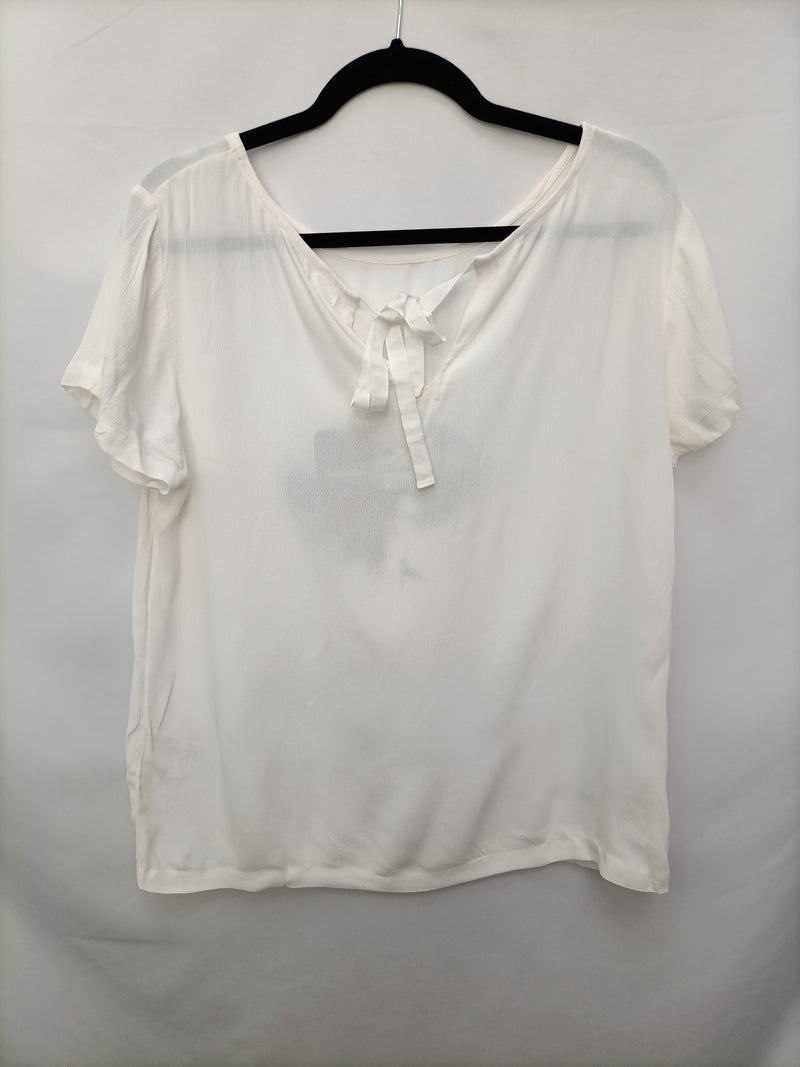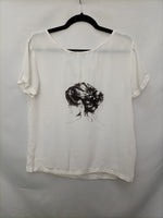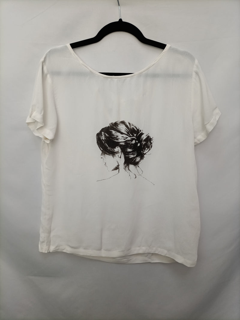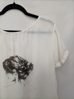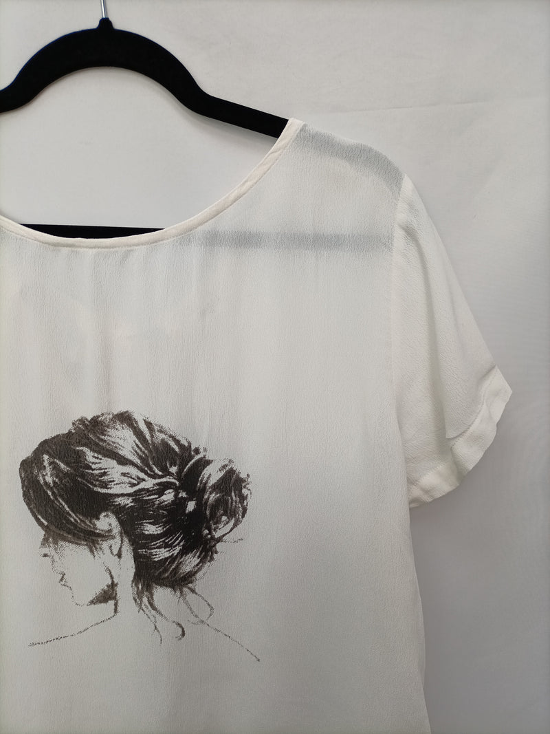Blusa blanca fluida con estampado de una mujer. No elástica. Con detalle de lazada en la espalda.