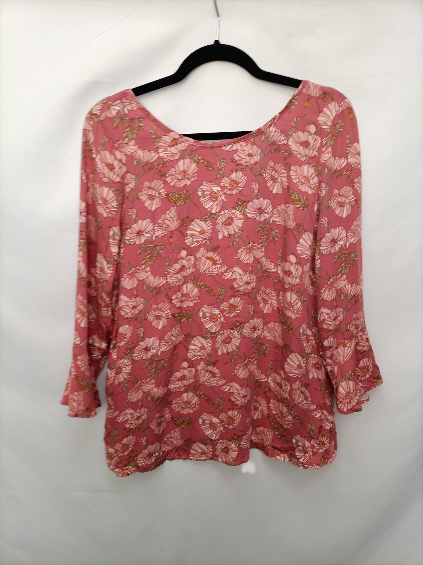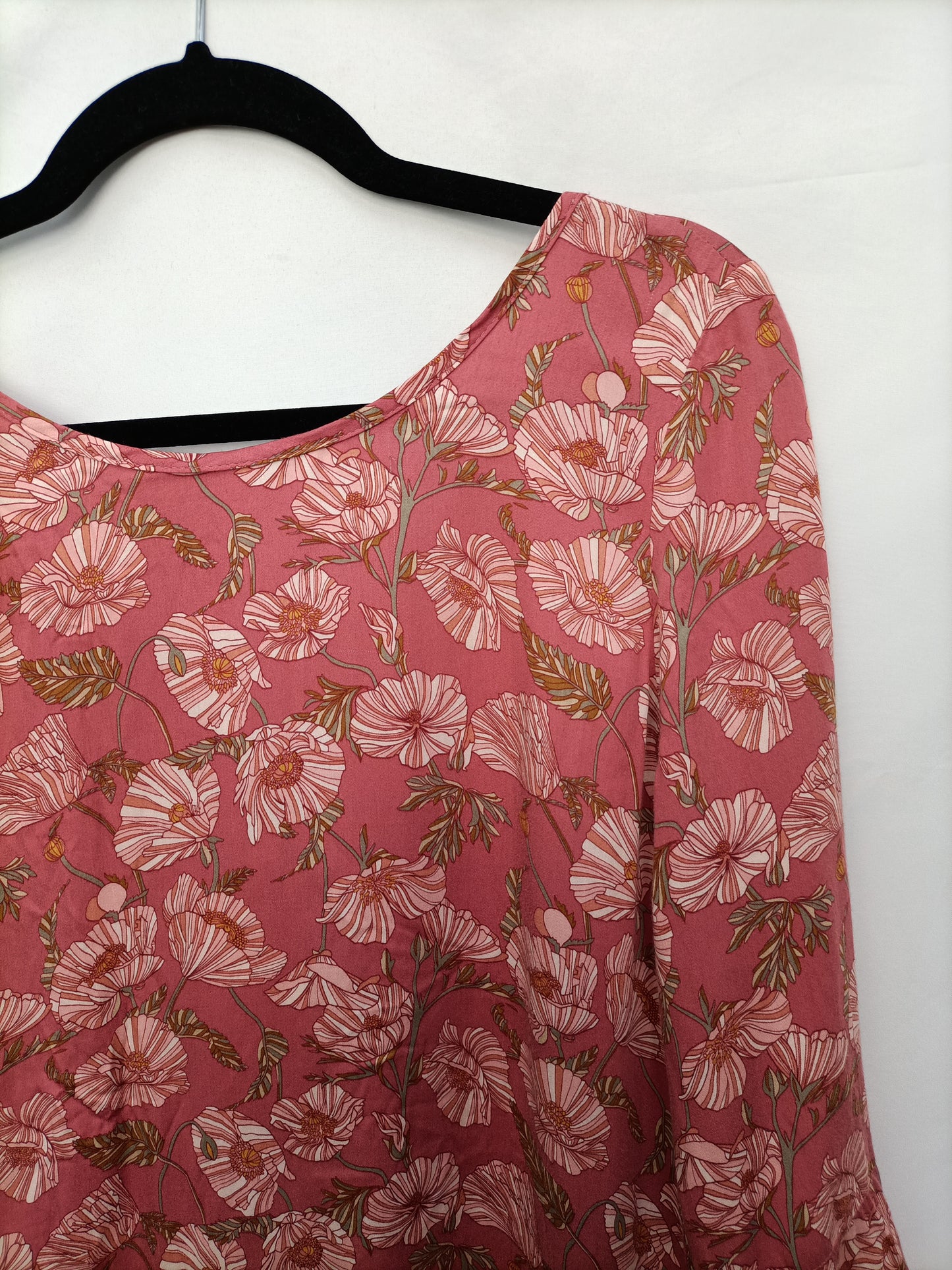 Blusa fluida rosa con estampado de flores. Mangas con mini volante. No elastica.