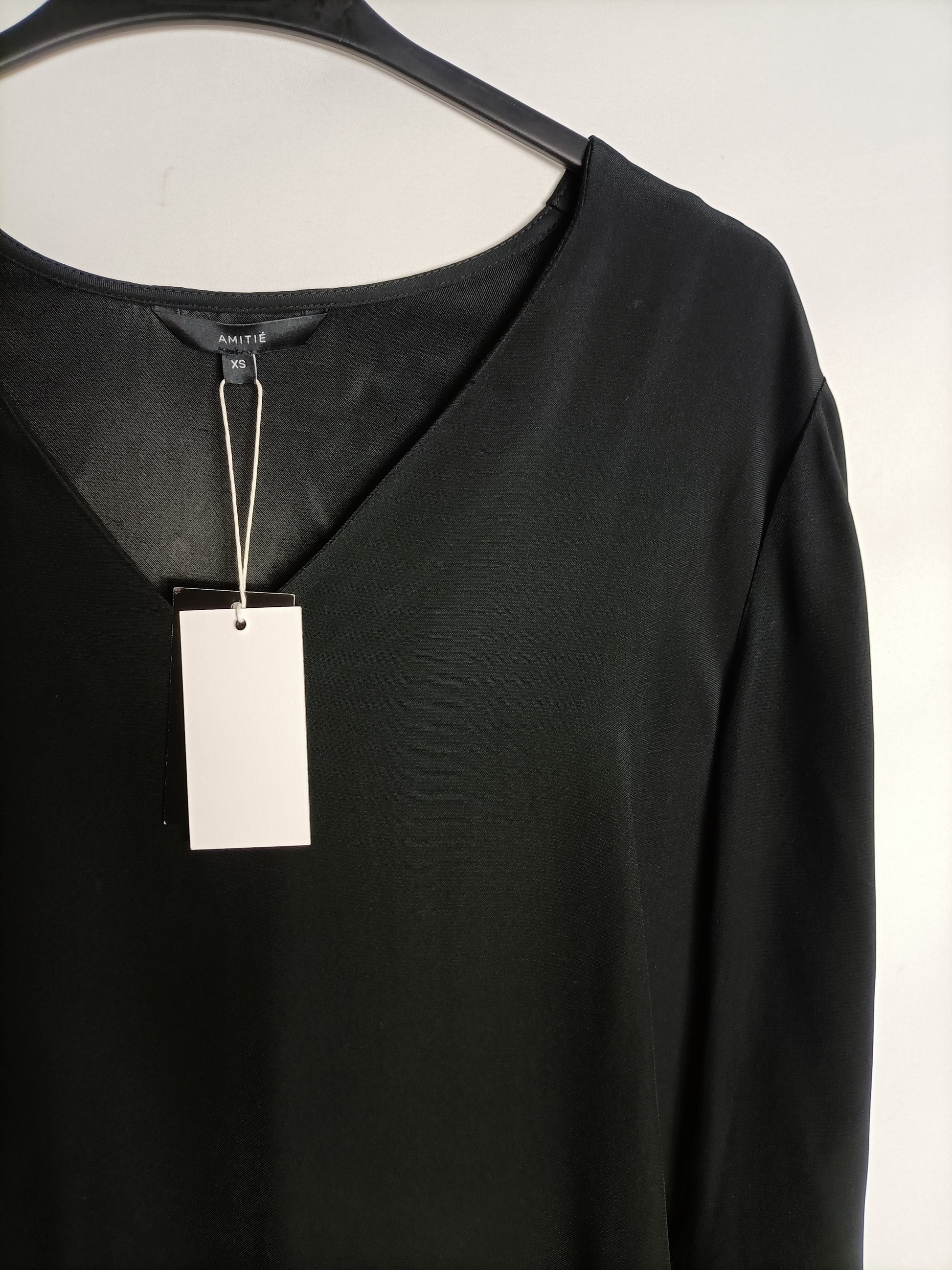 NUEVO CON ETIQUETA. Blusa negra satinada con detalle de volante en la parte de abajo.