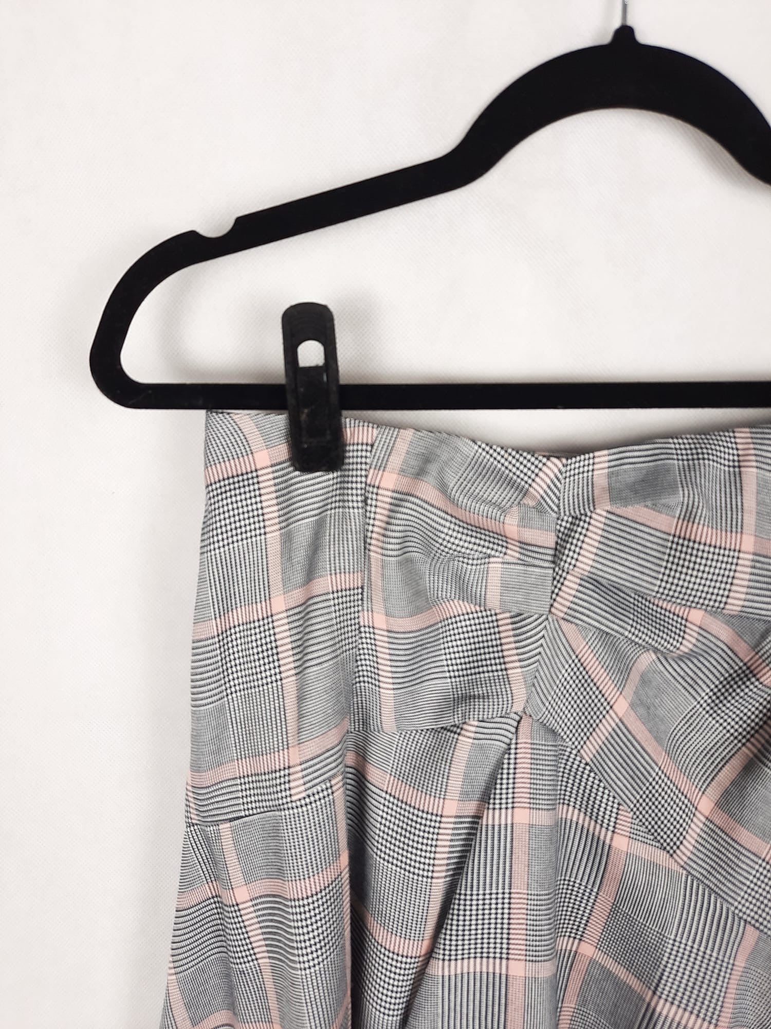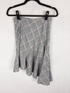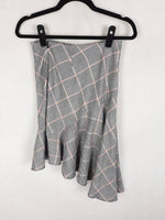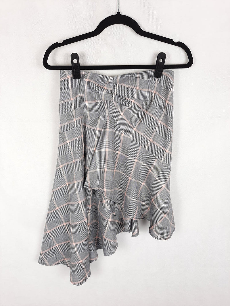 Falda de cuadros asimétrica con cintura fruncida y volantes. No es elástica. Se abrocha con cremallera. Cintura 34 cm