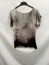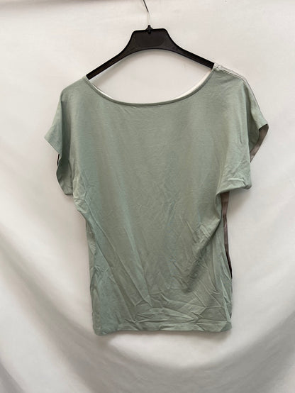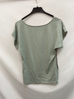 Blusa verde agua con doble estampado. Parte trasera de tejido tipo camiseta. Es fluida. De sisa a sisa 54 cm largo 61 cm