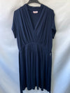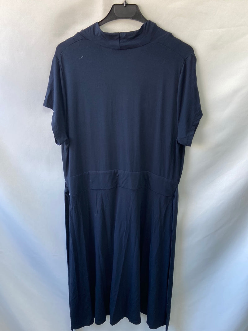 Vestido azul de tejido muy elástico. Escote pronunciado y cinturón incorporado. Largo 110 cm