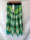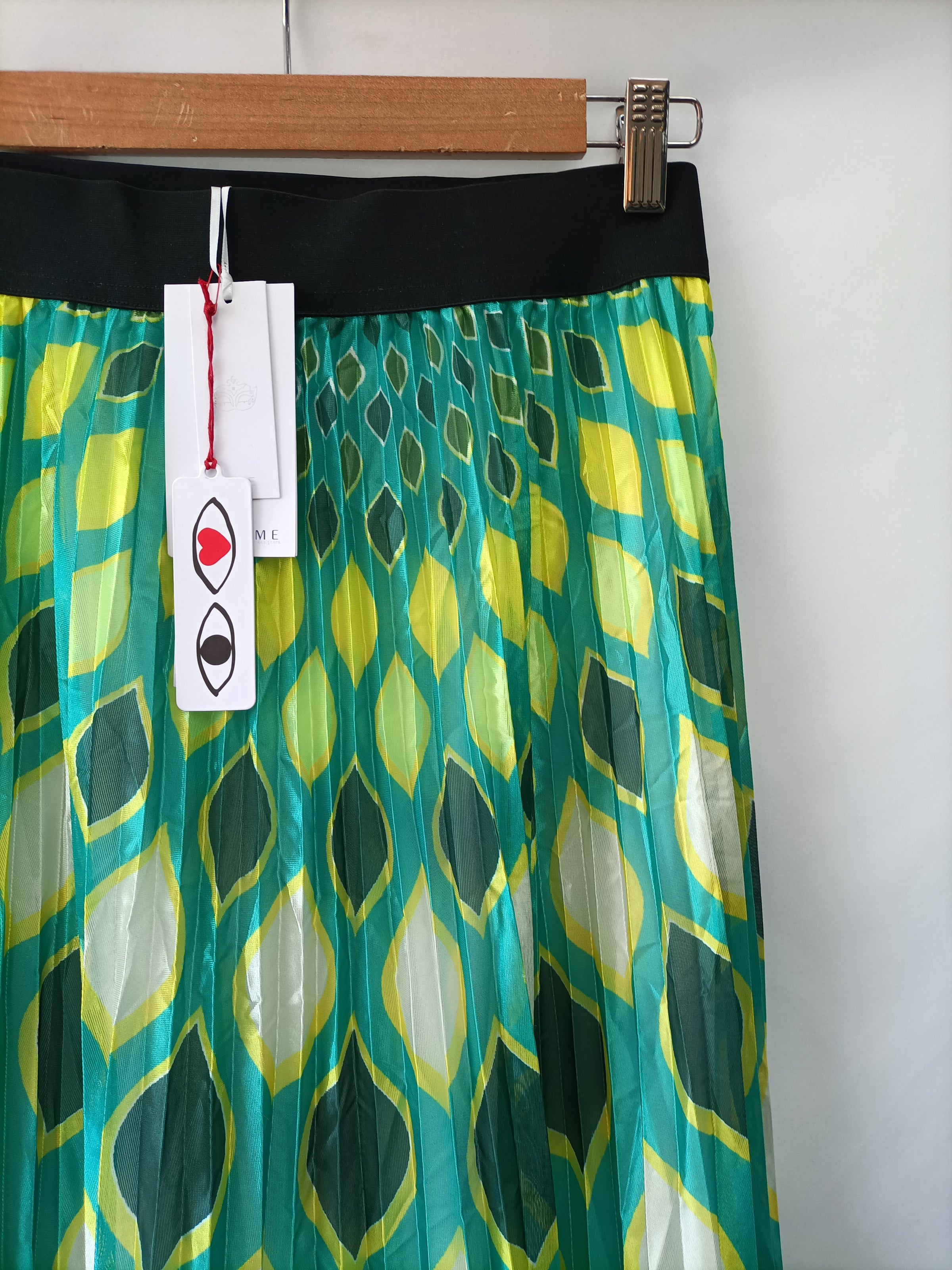 NUEVA CON ETIQUETA. Falda plisada acaba en hondas con estampado de gotas, cintura elástica. Largo 84 cm.