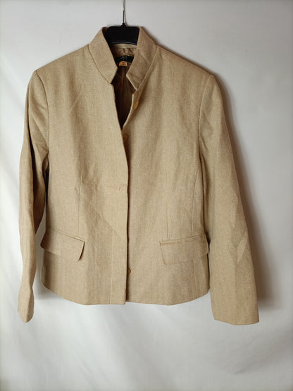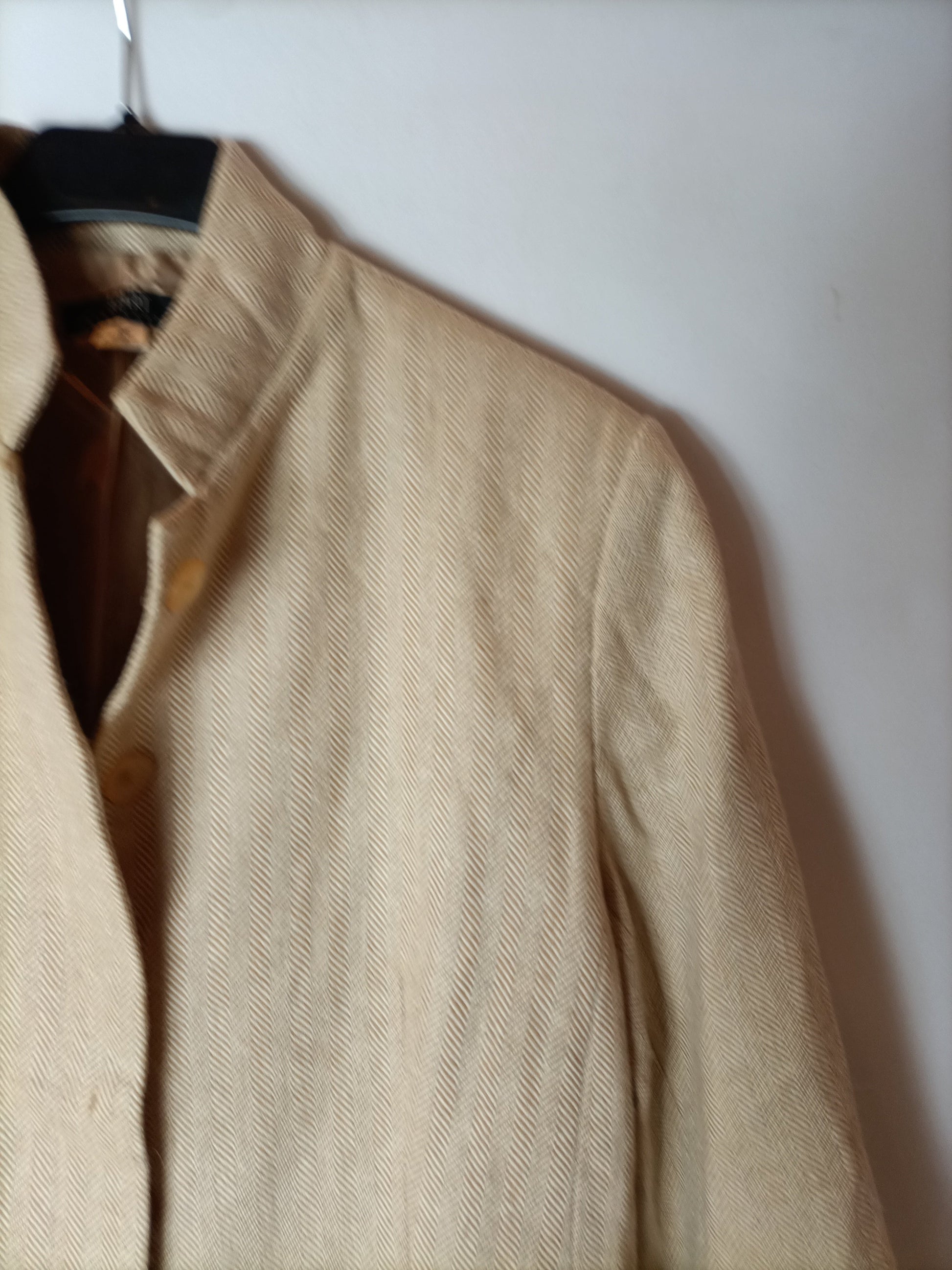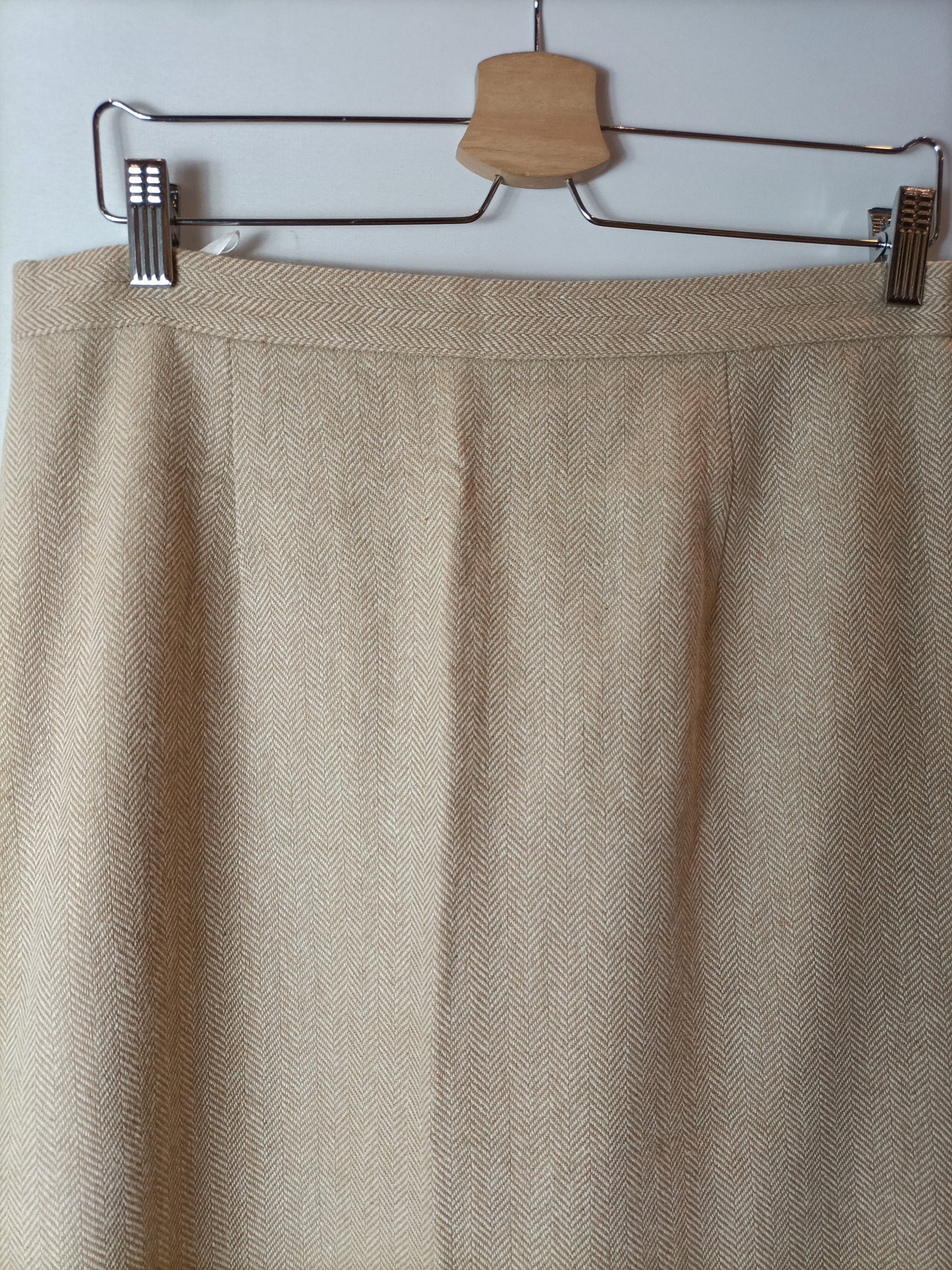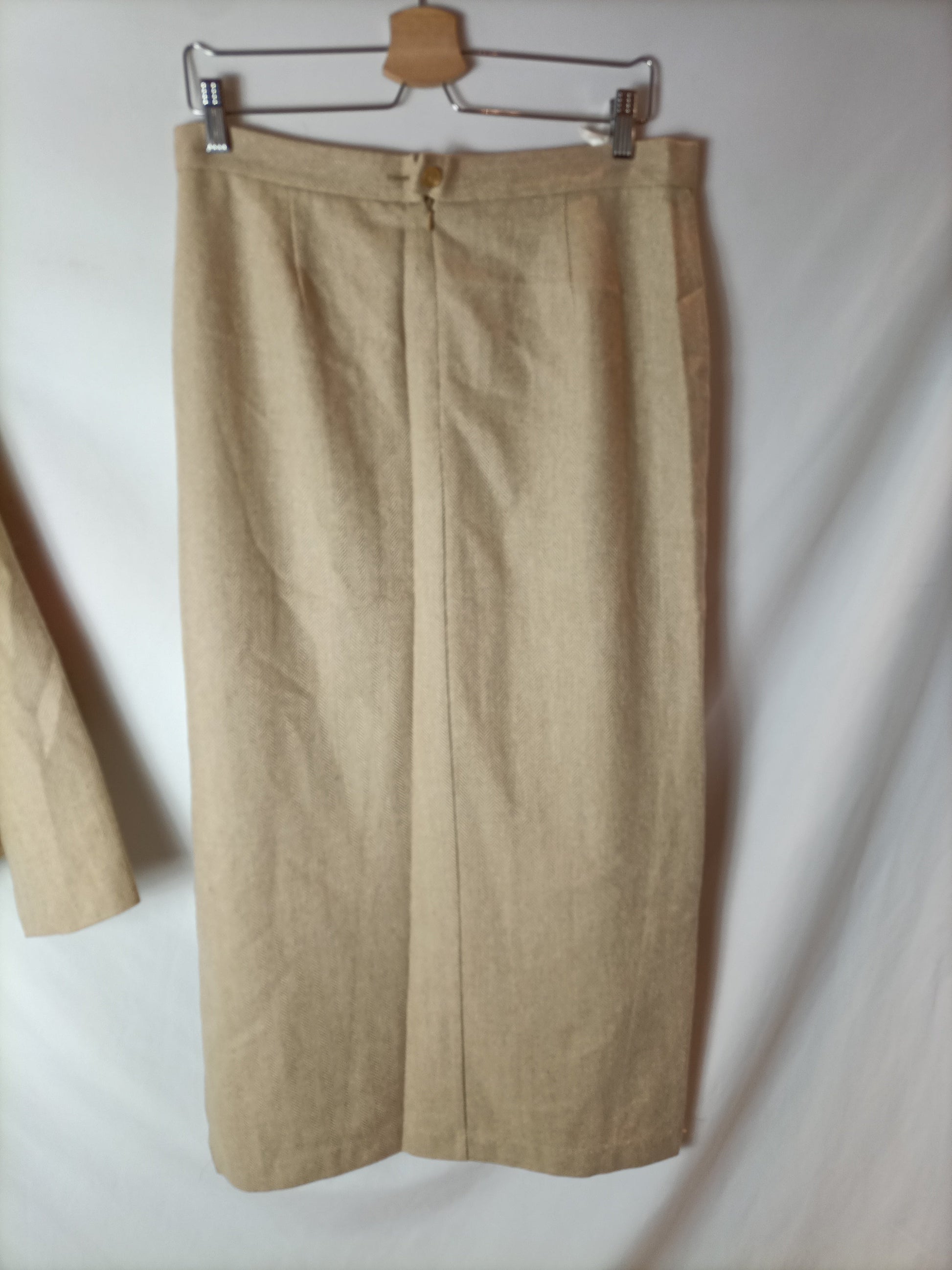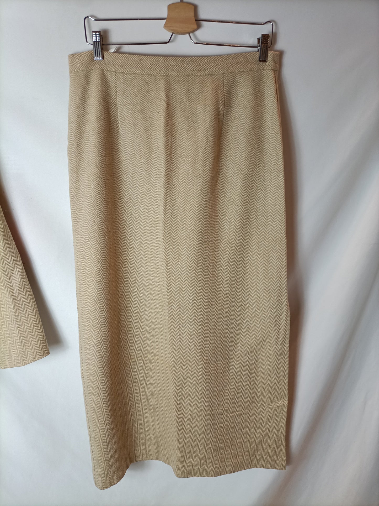 total look de falda mi di (tobillera) y chaqueta de espiga en tonos beige.