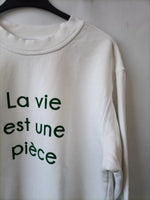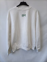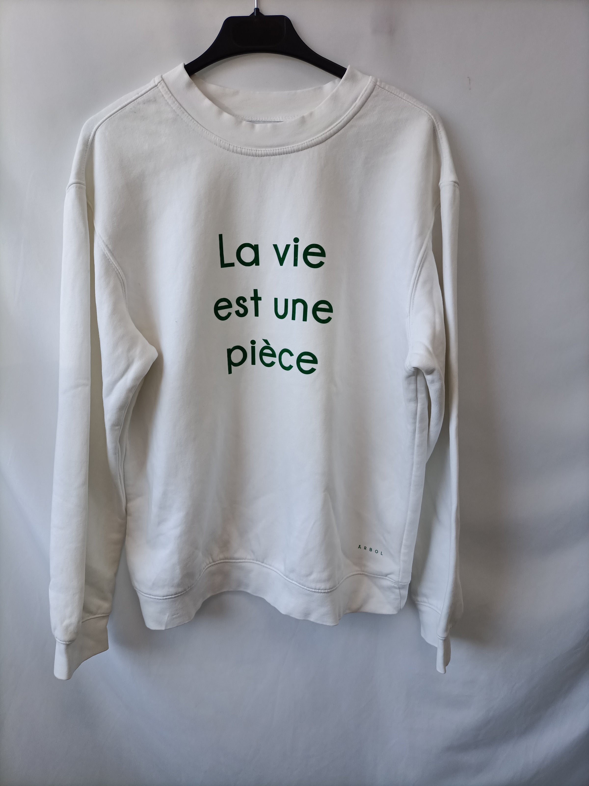 Sudadera blanca con letras en terciopelo verde. Oversized y elástica. Largo 63 cm