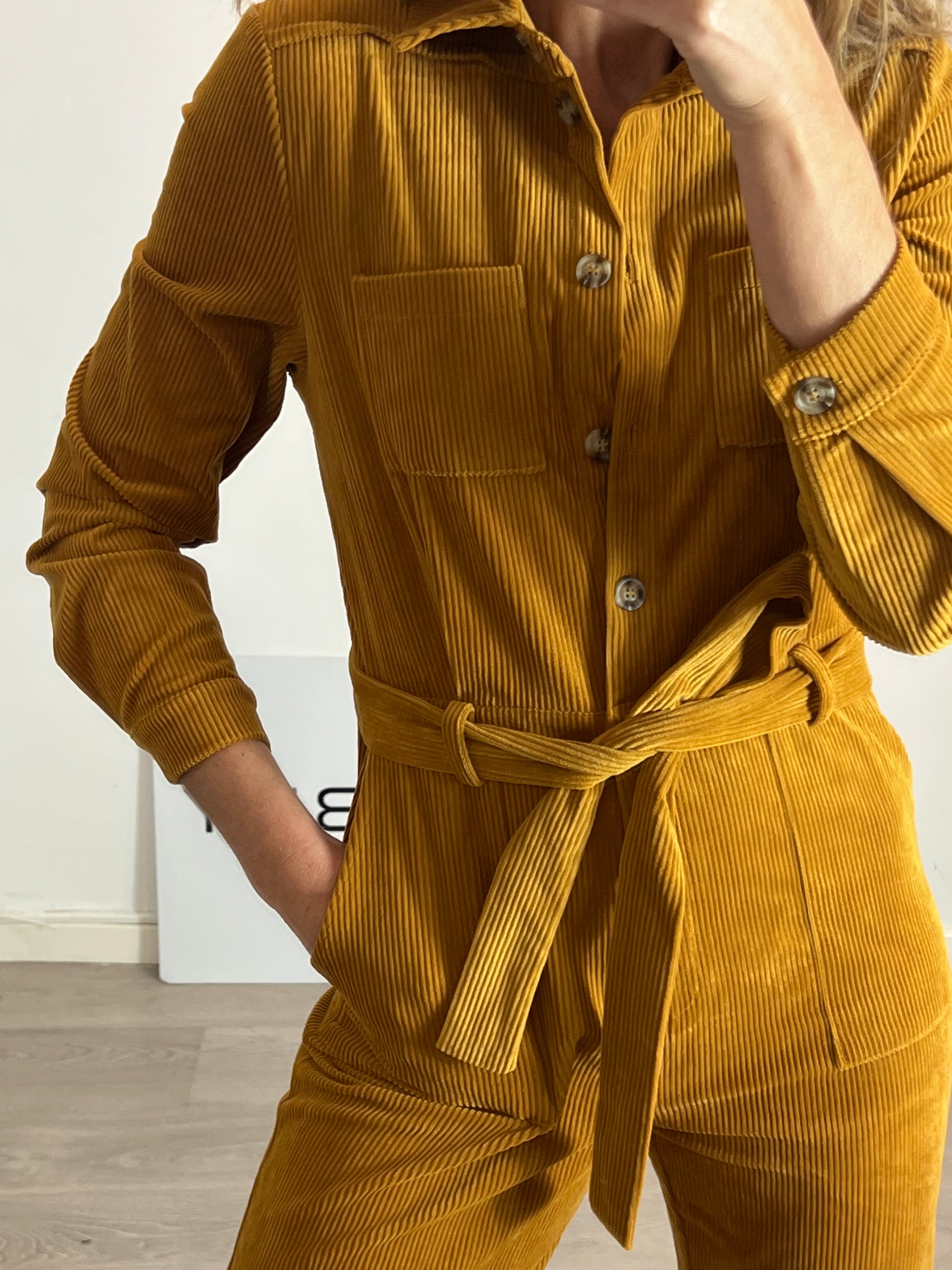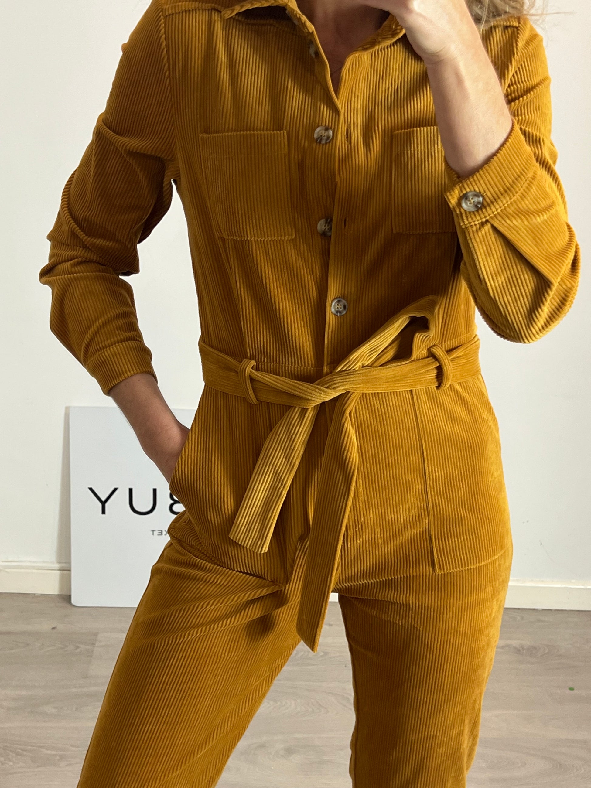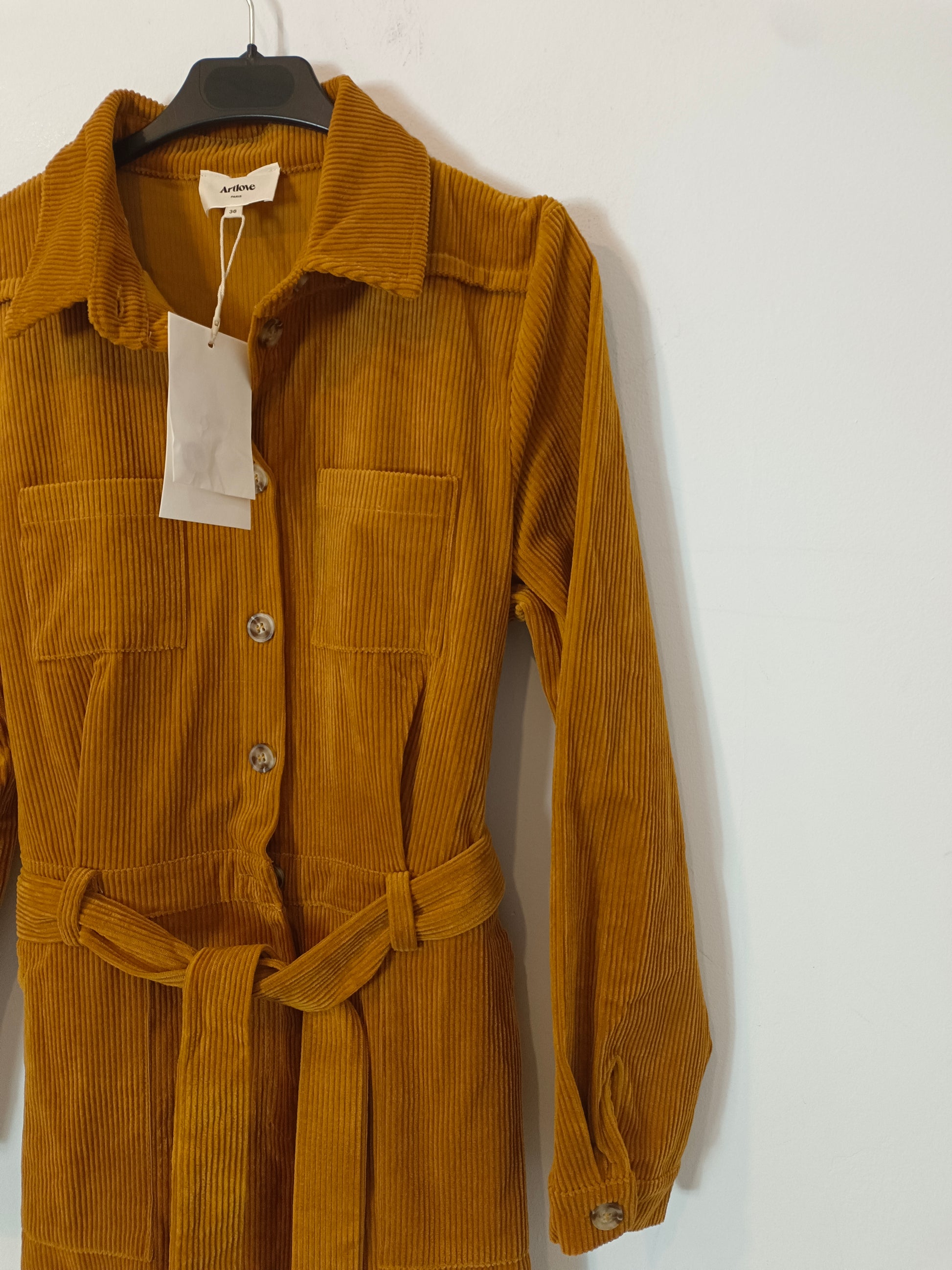 NUEVO CON ETIQUETA. Mono largo color mostaza con cinturón de lazada. De sisa a sisa 46 cm cintura 43 cm largo 146 cm