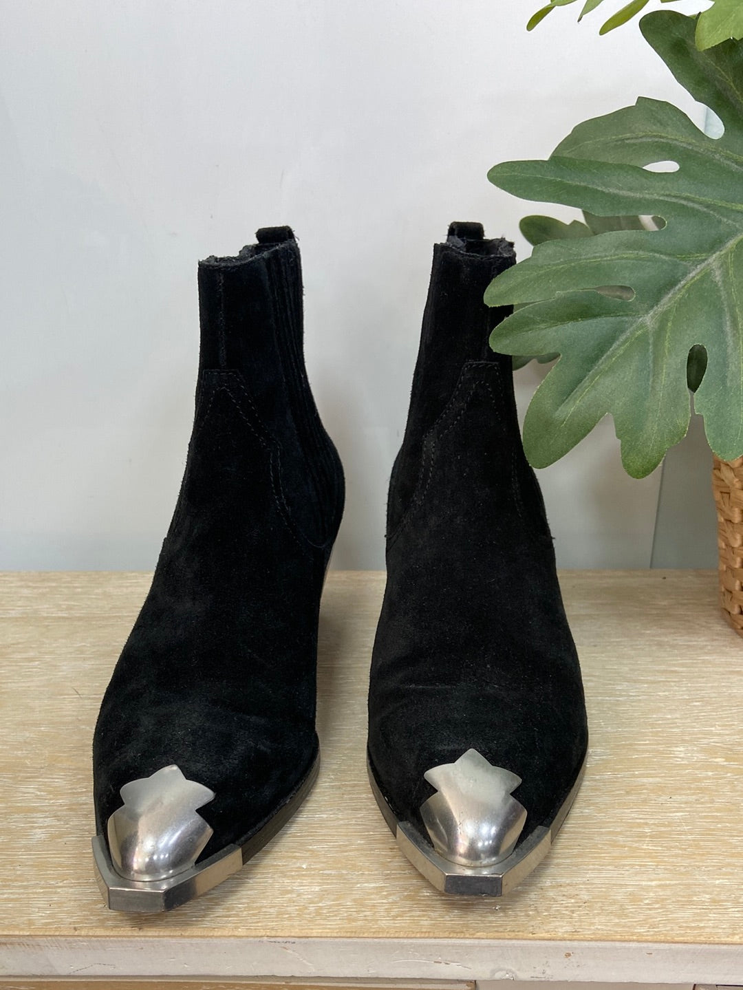 botines negros estilo cowboy caña baja con detalle plateado en la punta. Tacón de 5 cm