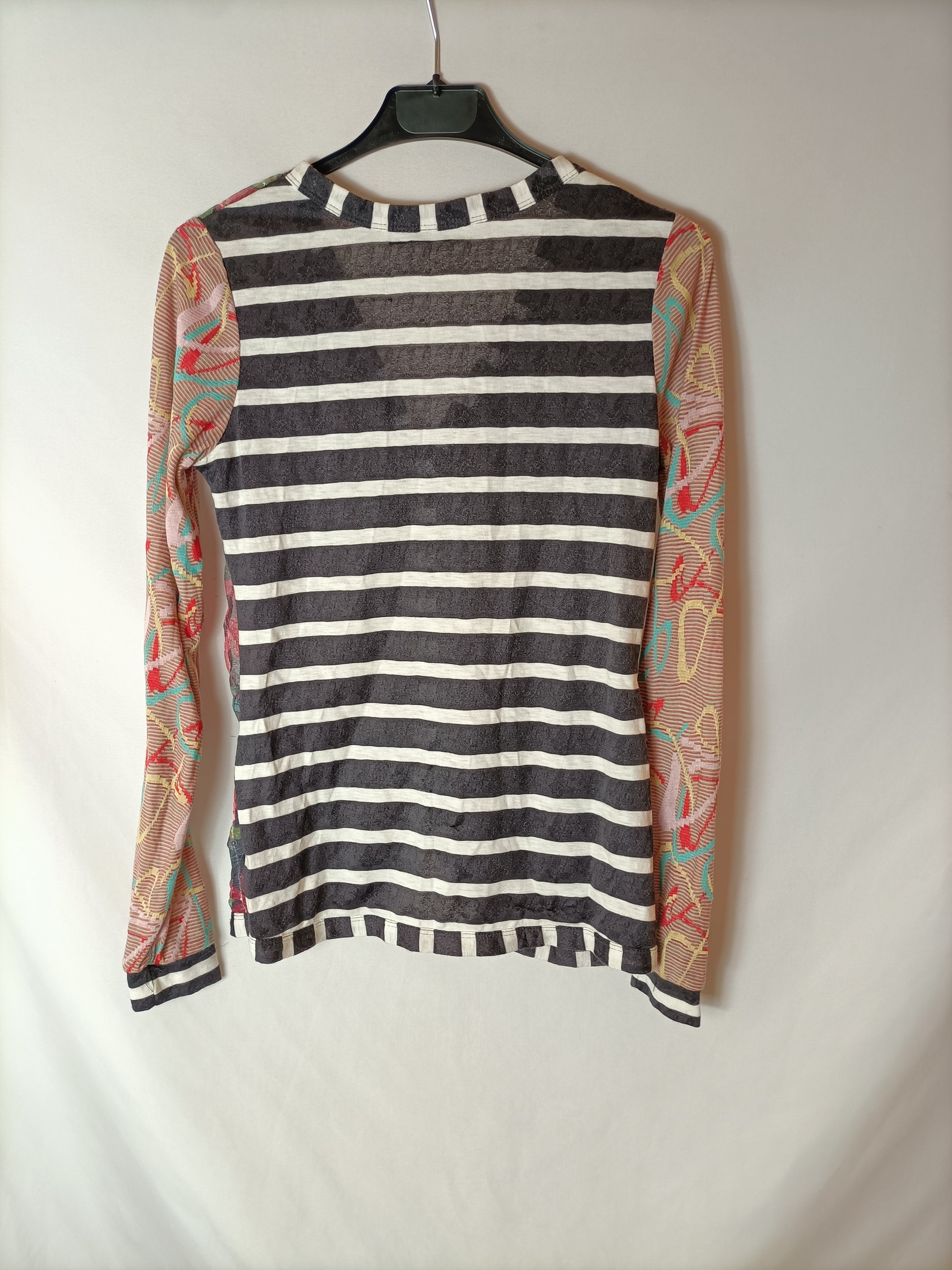 top/rebeca con varios estampados y la zona delantera de tull con lentejuelas .