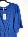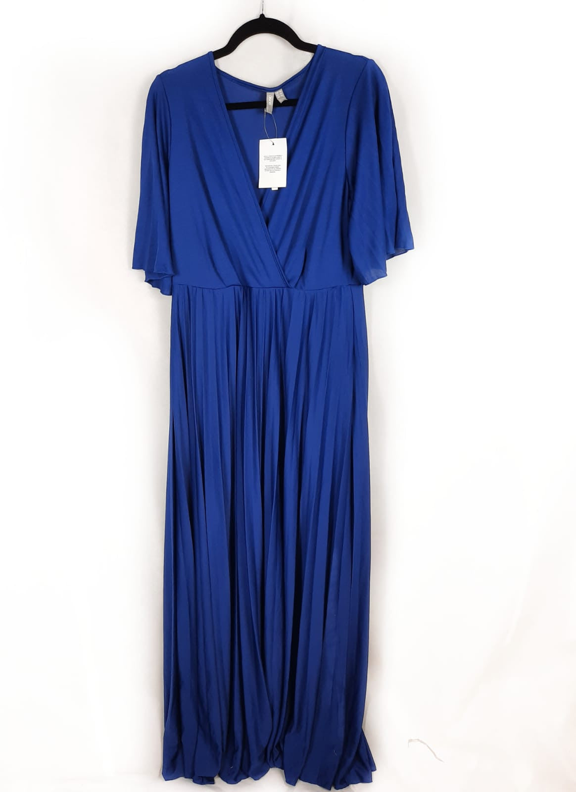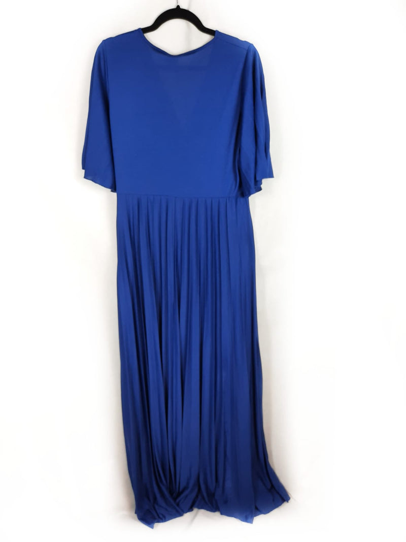 NUEVO CON ETIQUETA. Vestido largo azul klein de tejido plisado, mangas con vuelo. Es muy elástico y fluido. Largo 156 cm