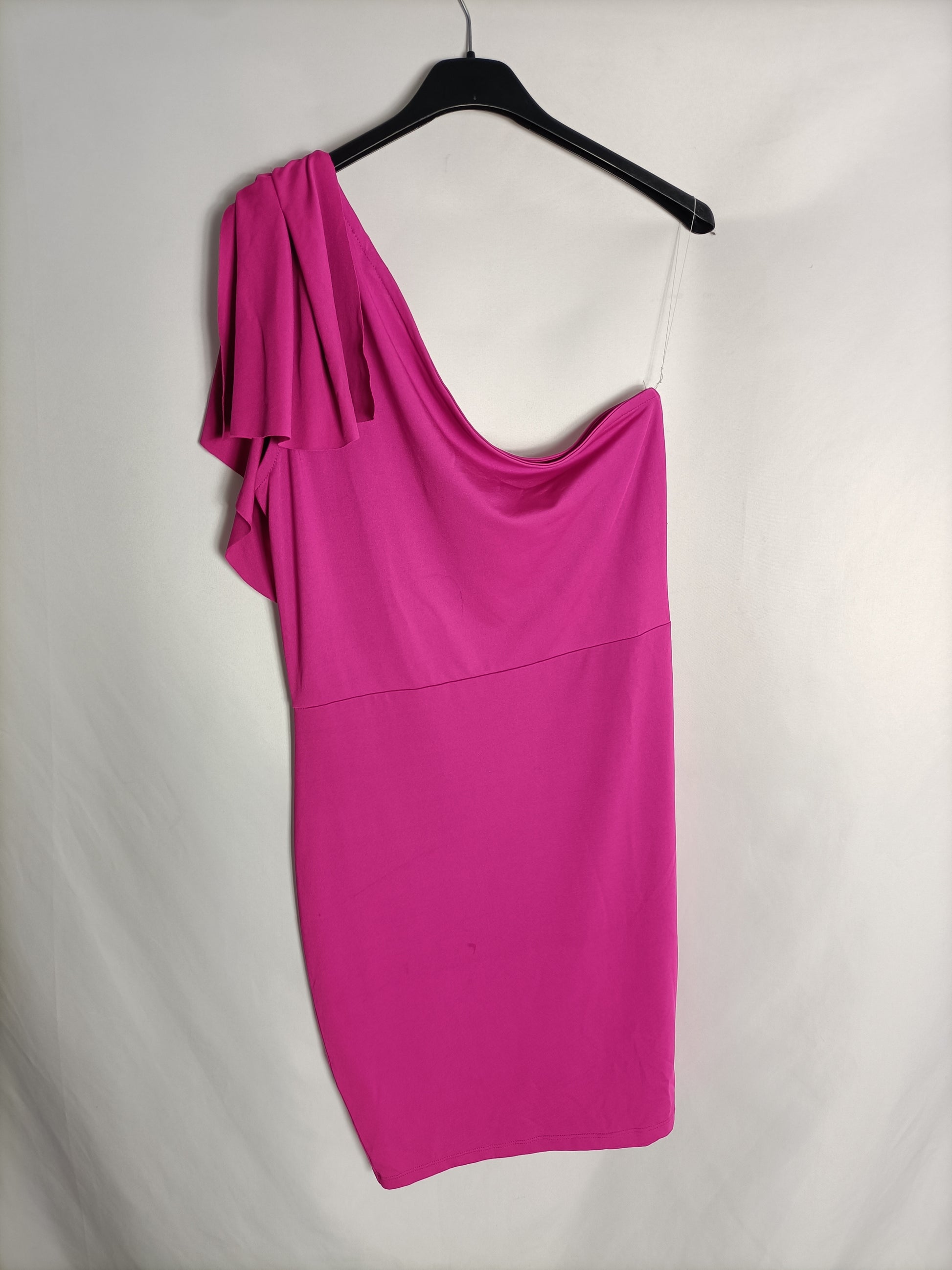 vestido corto rosa escote asimétrico y tejido estilo licra elástico