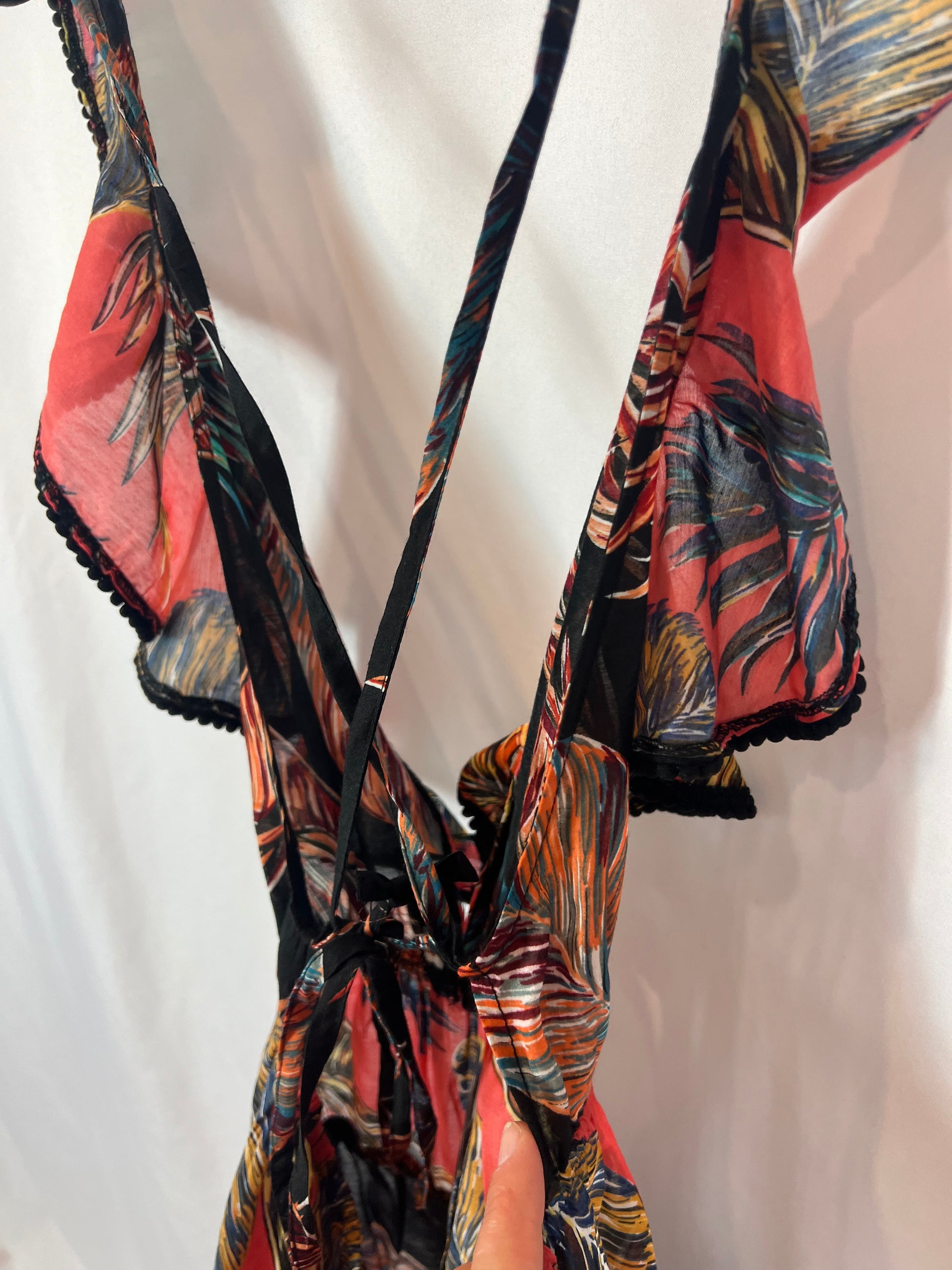 Vestido corto rosa con estampado de flores. Espalda al aire y escote atado al cuello. Largo 87cm