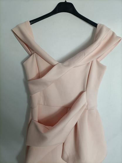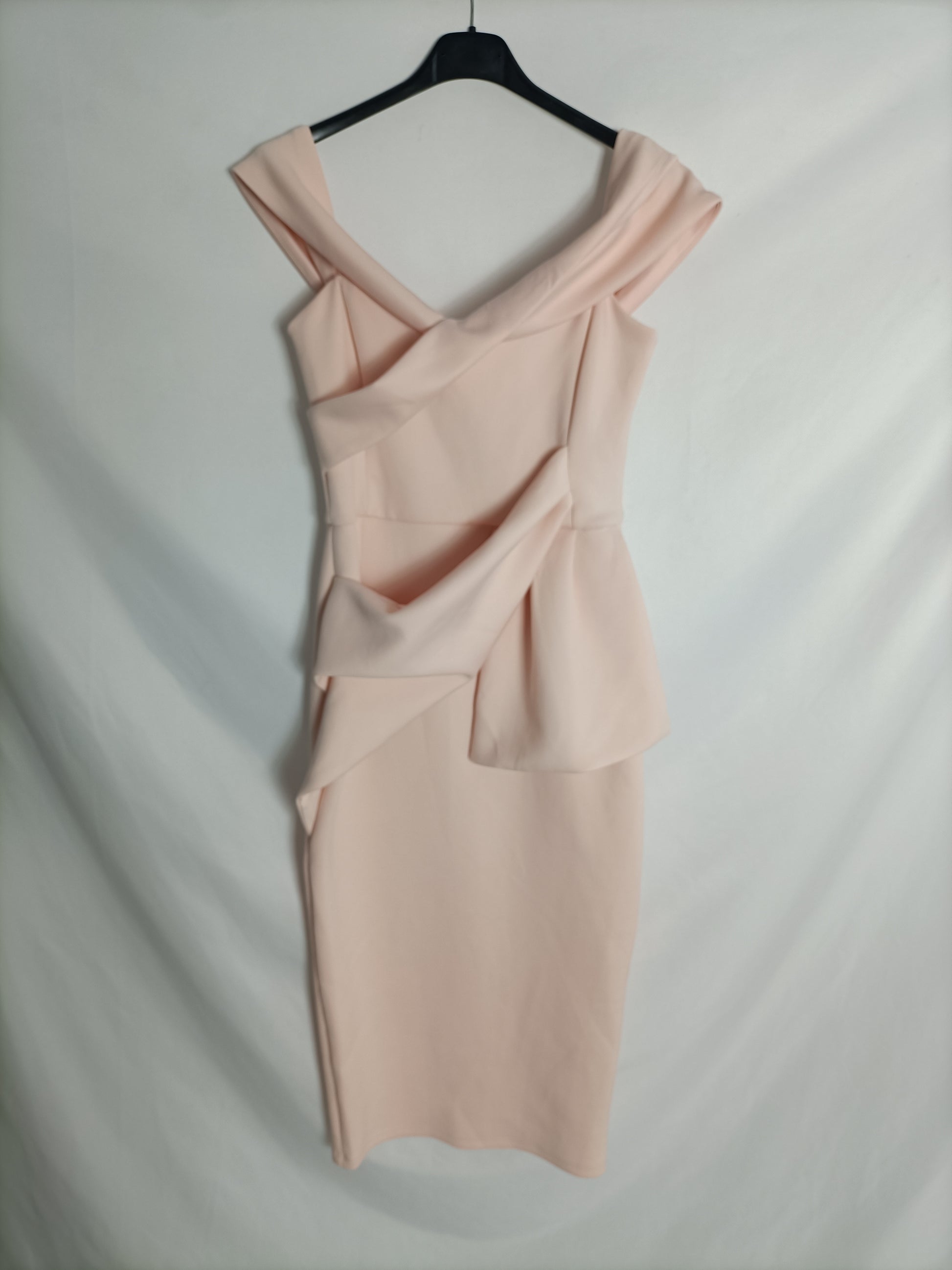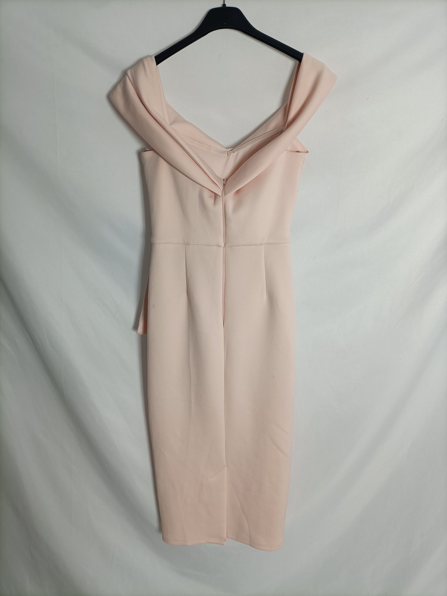 Vestido rosa escote bardot cruzado de tejido de neopreno. Entallado y semielástico.