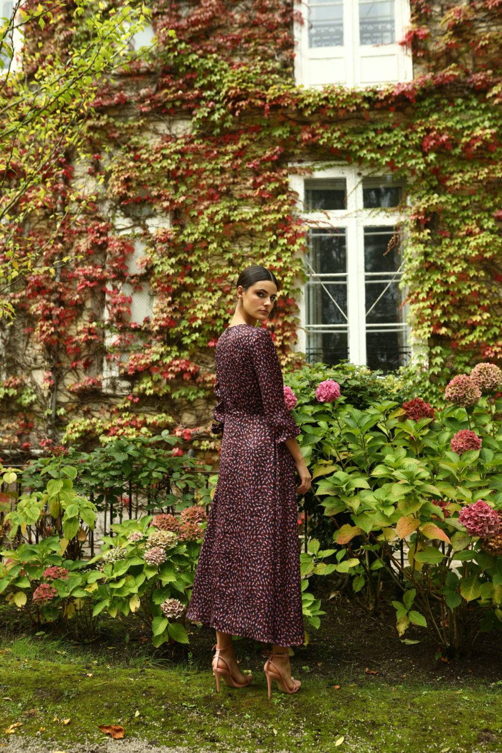 Vestido midi burdeos y rosa print. 100% Poliéster (gasa) Forro 100% Poliéster