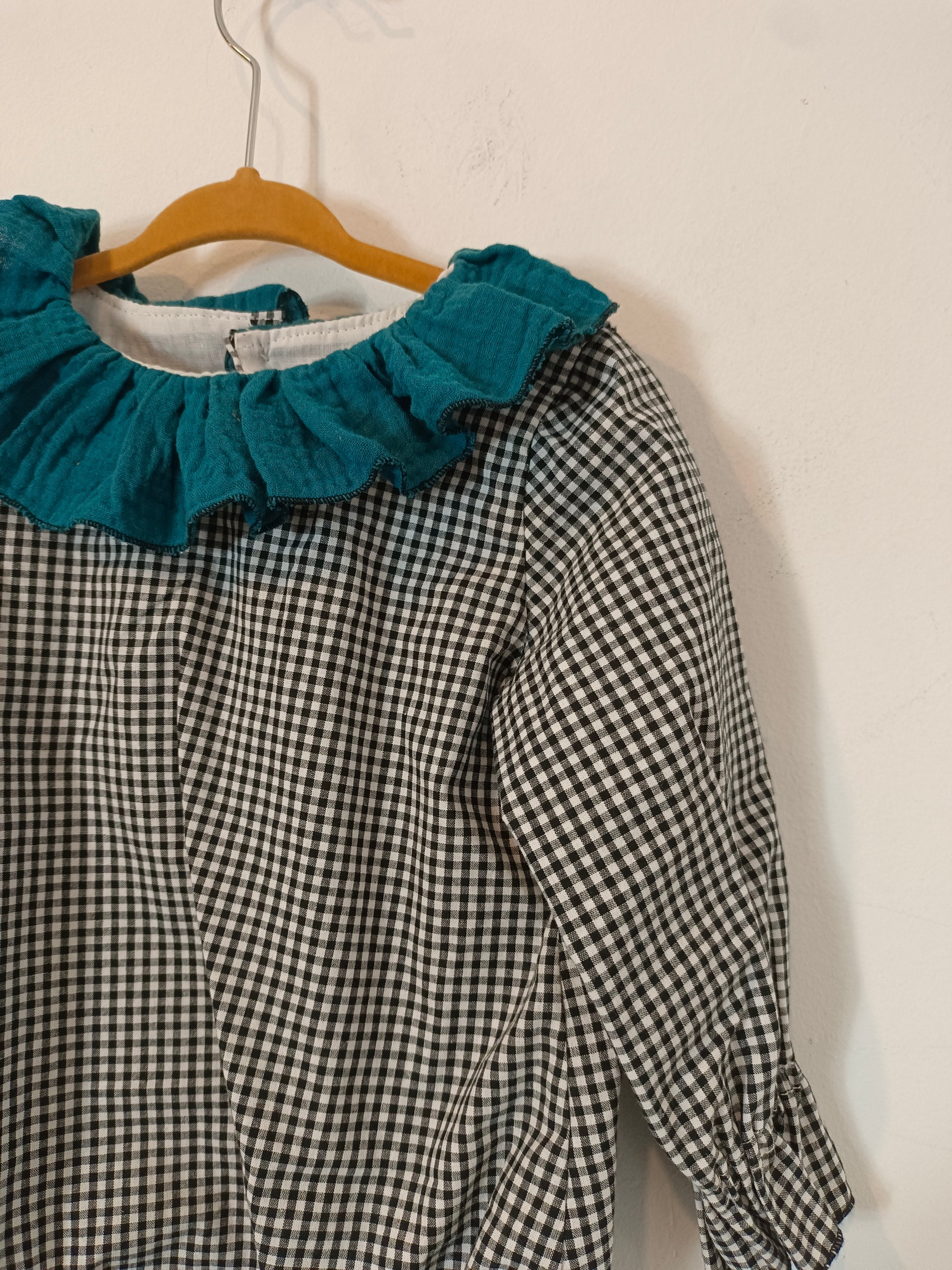 Ranita de cuadros vichy negra y blanca con cuello azul
