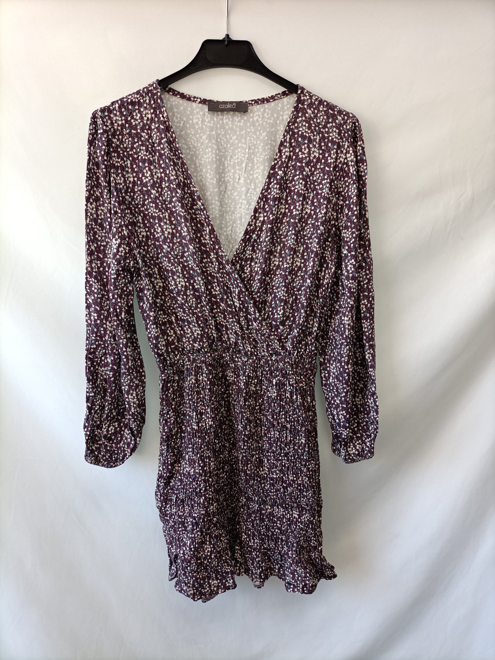 Vestido morados con flores y detalle debido de abajo en la falda elástico. Escote cruzado. De sisa a sisa 48 cm largo 82 cm