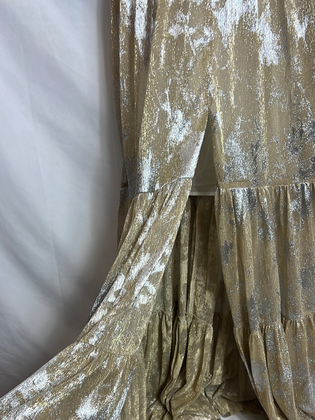 Vestido largo dorado y plateado. Cintura semi elastico 31cm, largo 160cm. De sisa a sisa 44cm. Parte de arriba semitransparente